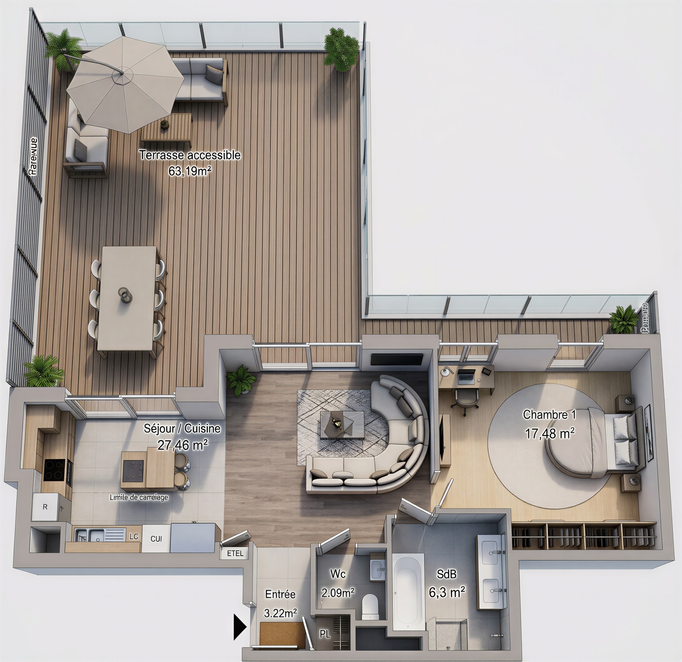 convert this floor plan into a realistic isometric 3d view of a full house show the space from an elevated angle with furniture walls and details visible keep everything as it is in the picture its already perfect just change the floor interior for waxed concrete floor and the exterior terrasse for brown exterior style woods use the same furniture as shows on the plan do not change the orientation of the floorplan