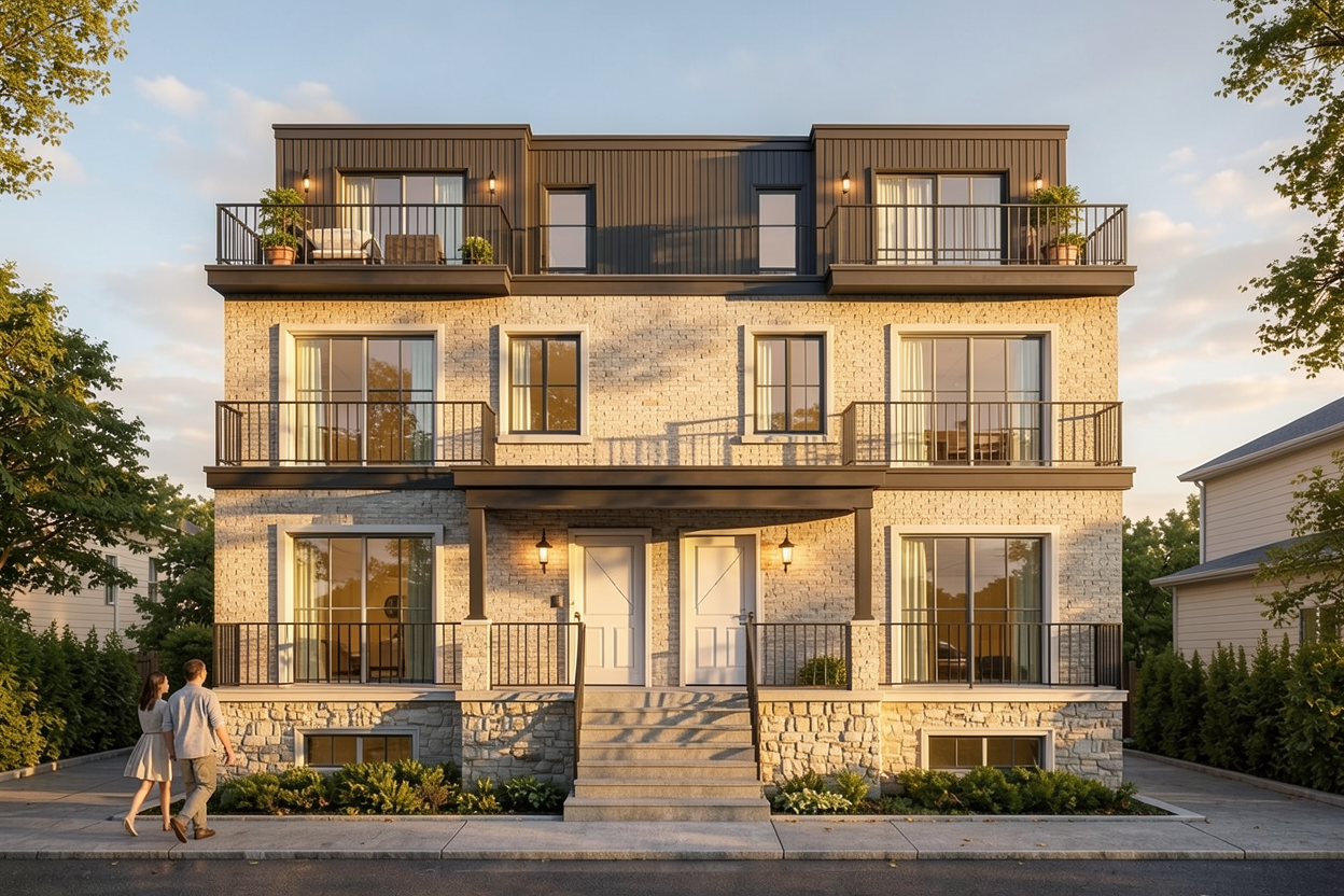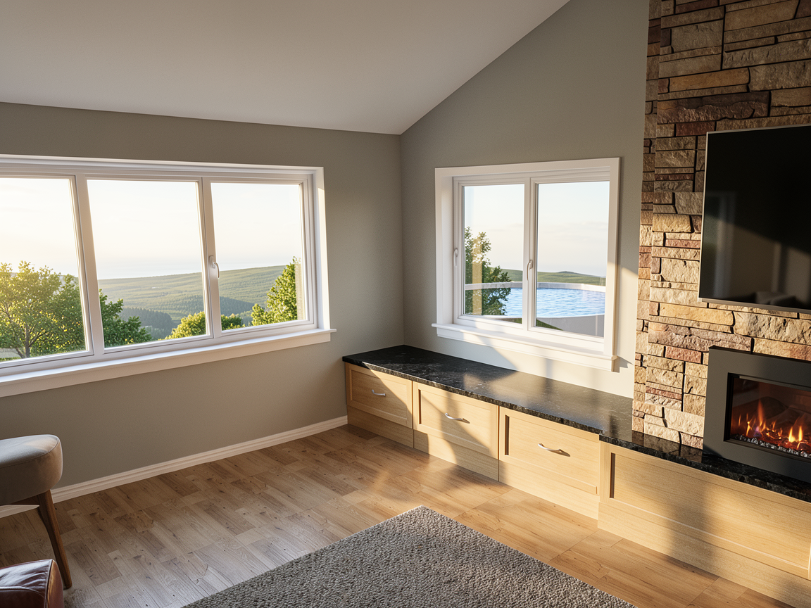 architectural interior scene fully preserving realistic materials and textures wood concrete glass metal and textiles table with a glass top in the center of the room empty soft natural light from windows combined with warm artificial light highlighting details realistic perspective accurate shadows and reflections furniture and objects in original proportions photorealistic style ultra high resolution subtle depth of field background shows a historic modernist city from above focusing on rooftops floors and building heights without showing the street level colors and materials true to reality no artistic stylization respect the wallpaper print and texture