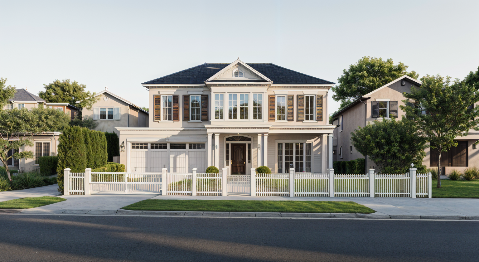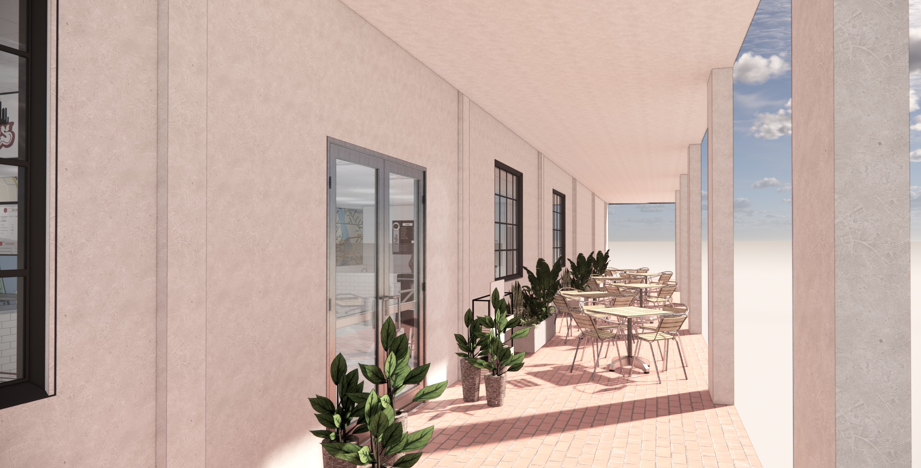 exterior patio of sunny morning cafe with coffee and bagels in an apartment neighborhood next to small road