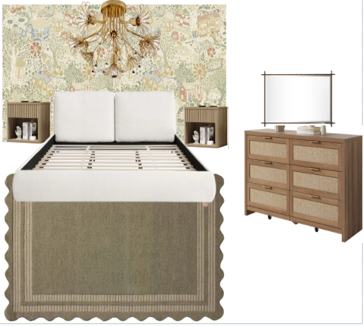 create a cozy and elegant bedroom interior featuring a plush double bed with a soft white headboard and a beige scalloped edge bedspread include a vintage style wallpaper with intricate floral and village patterns in soft greens reds and blues add a golden chandelier with whimsical artistic elements to bring warmth and sophistication position two sleek wooden side tables with minimalist decor on each side of the bed complementing the warm wooden tones place a chest of drawers with a light wood finish on the opposite side topped with a large simple mirror ensure the atmosphere is warm inviting and harmonious blending rustic charm with modern elegance