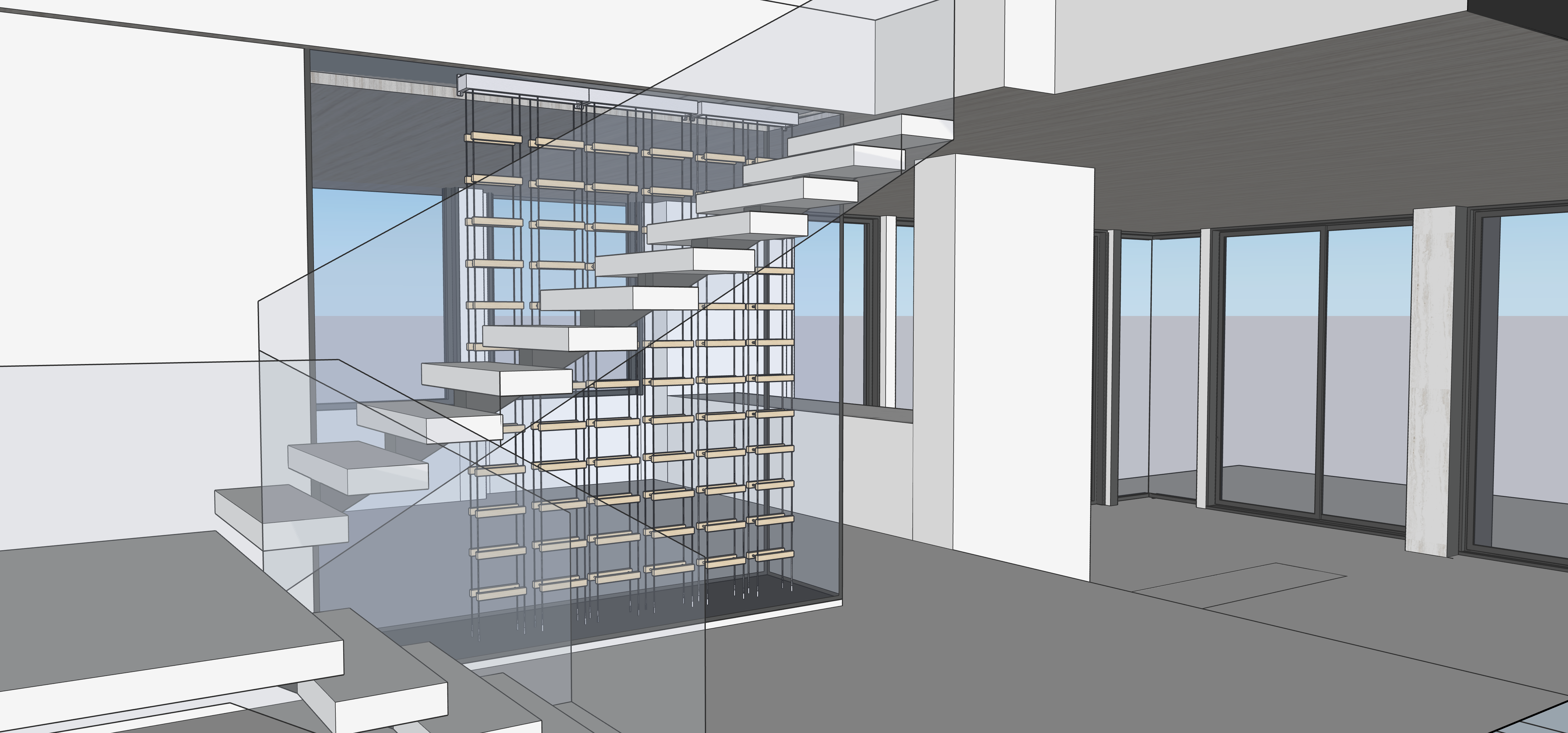 exterior shot please render a photorealistic image usinging the base skecthup model provided please reference the mood board images for all colors and furniture inspiration floating wood tread stairs with single black stringer and glass railing wine wall in the enclosed glass next to the stairs please match the materials lighting and mood of the mood board image