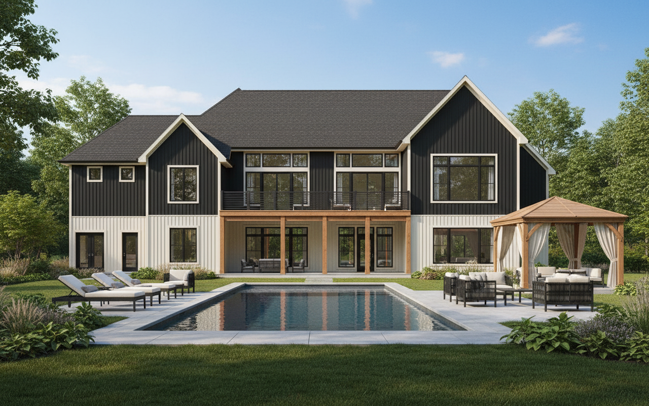 black and cream color palette for siding hardie panels add landscaping vertical batten cedar posts under deck make it modern with no farmhouse vibes add a pool with built in spa on same level as pool add a cedar gazebo with curtains add outdoor furniture no stone or brick on the house zoom way out add trees