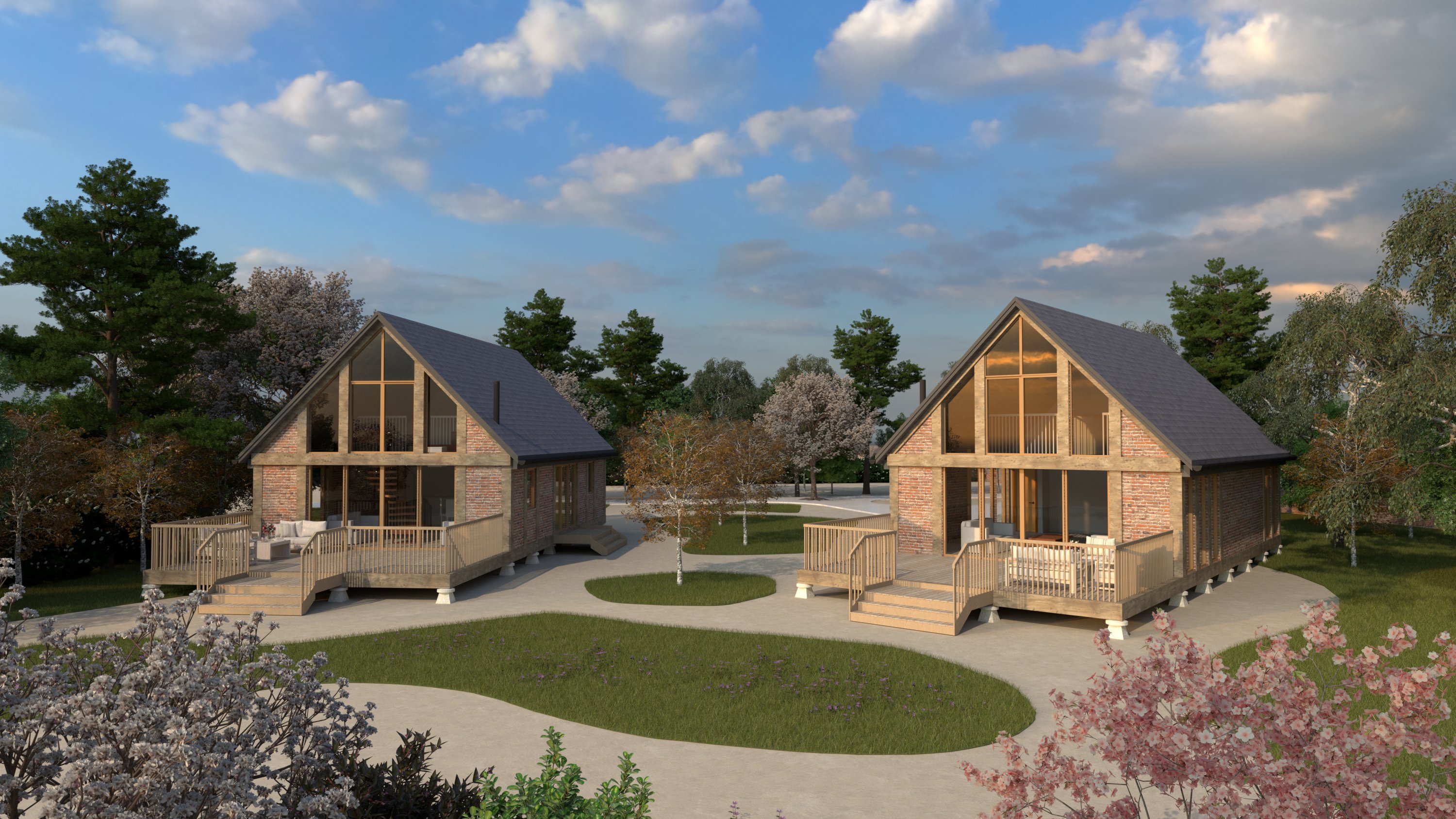 create an architectural render of two staddle stone lodges the lodges are made from brick with timber framing the front facade of each lodge has glazing between the timber framing with the reflection of the surroundings at the front of both lodges is a timber terrace the staddle stones below each lodge are very small in size surrounding the lodges is soft planting and shrubs with gravel paths in the background is low level trees there is natural lighting with some soft clouds ambient lighting from landscape lighting around the lodges
