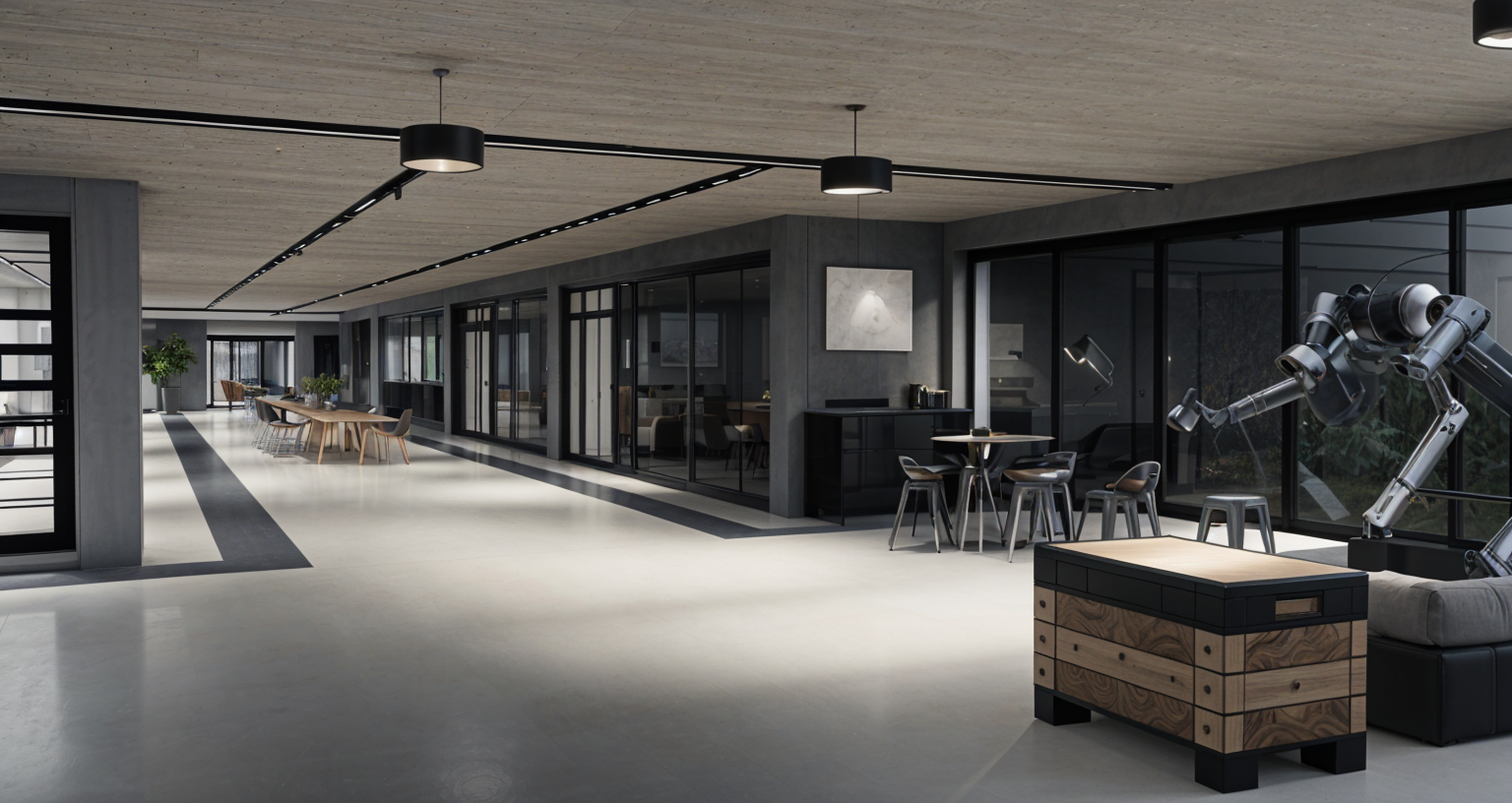 interior shot make a comfortable home gym with sofa in the centre and few deep green plants a wall ladder on the right side next to white and glass doors