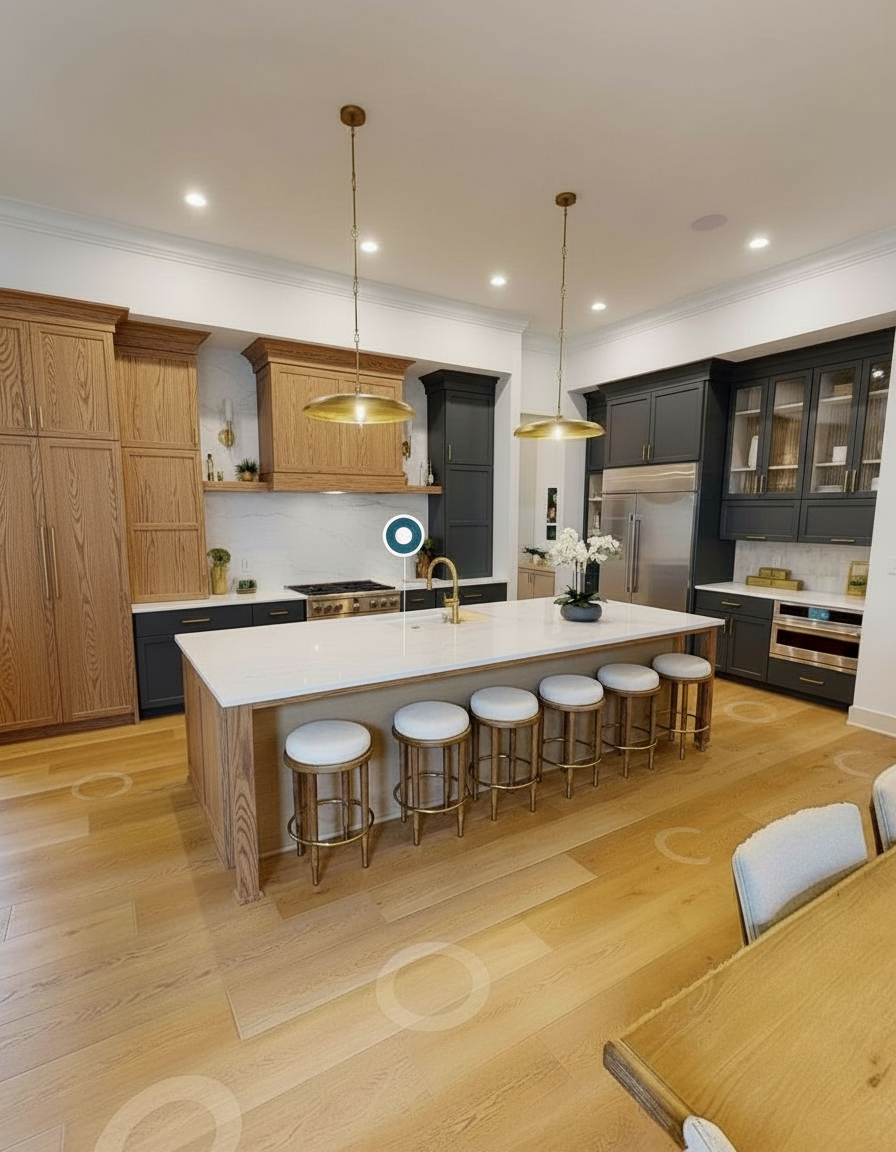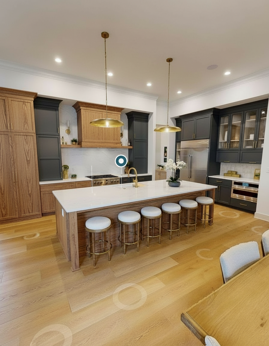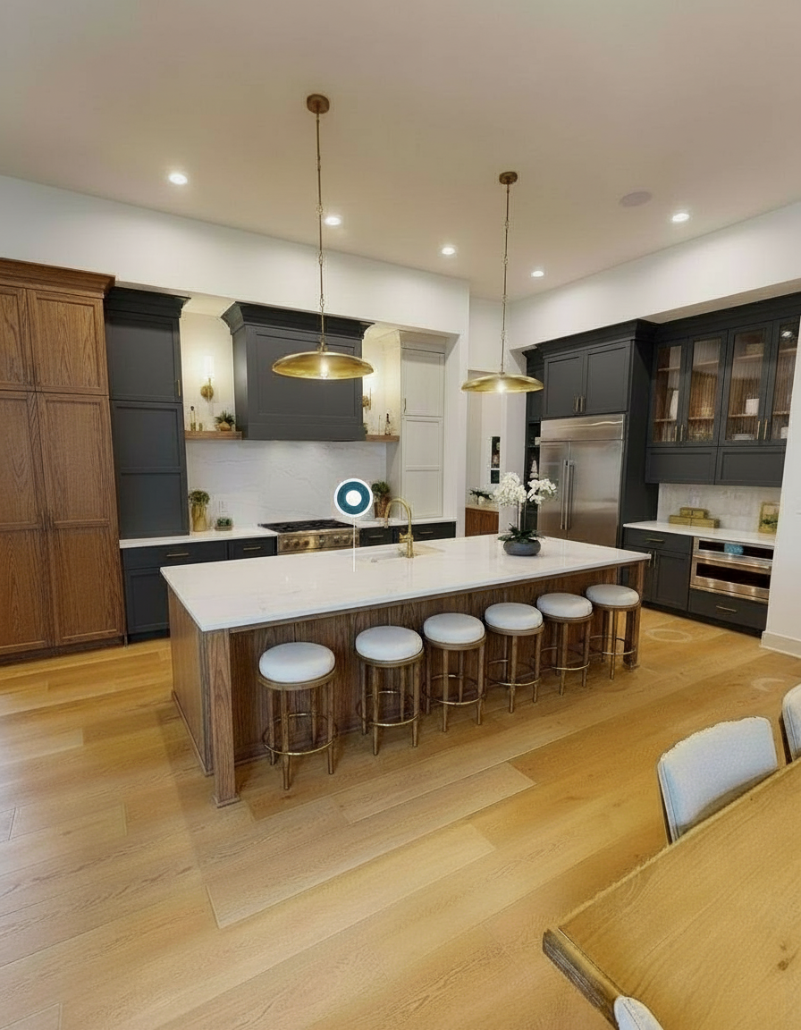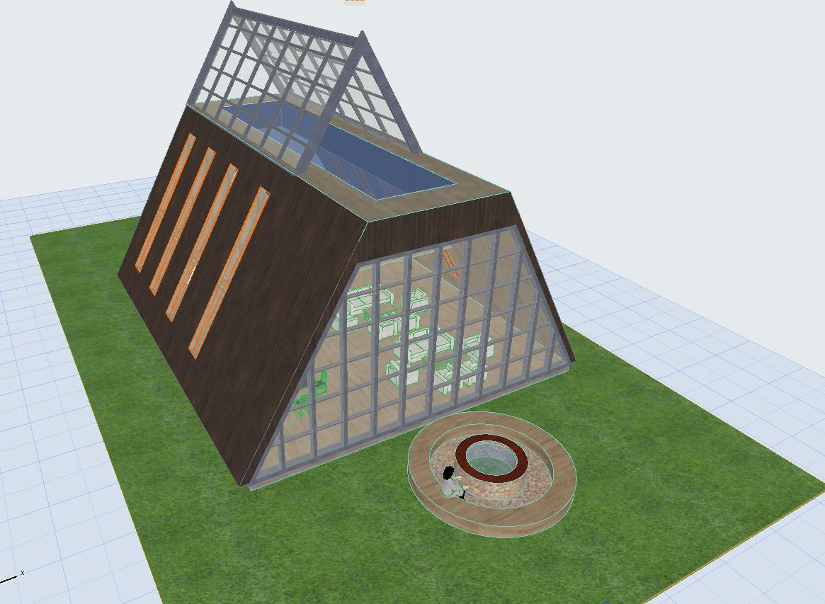 zaha hadid exterior shot a modern a frame building with a sleek wooden exterior featuring dark brown wood panels and large transparent glass windows the windows are outlined with metallic gray frames the roof has an elegant lattice structure in soft gray enclosing a sky blue pool the house is set on a vibrant green lawn creating a peaceful and natural atmosphere in front of the building is a circular wooden deck in a light brown hue with a stone fire pit in the center the surroundings mountain near the lake under a clear blue sky architecture