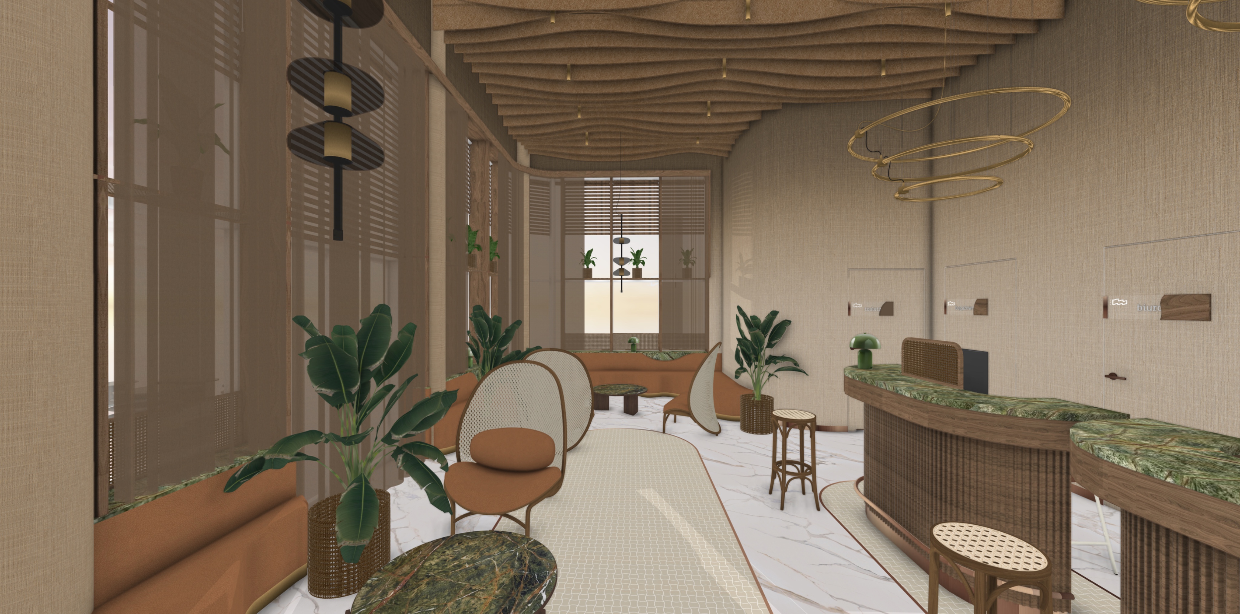 create a render in hyper realistic architectural visualization quality 8k resolution all objects furniture and architectural features must remain in place do not add any objects or delete anything from the image the spatial configuration must remain unchanged warmth gentle reflections soft shadows enhanced color richness and luxurious level realism improve depth and realism through wood grain richness brass highlights fabric texture and polished clarity while keeping the entire scene exactly as originally designed use downward facing light from the spherical wall lamp next to the round wall mirror use general daylight lighting in the room use a smooth white wall surface above the tiles the wall covering should be the same light color as the floor covering