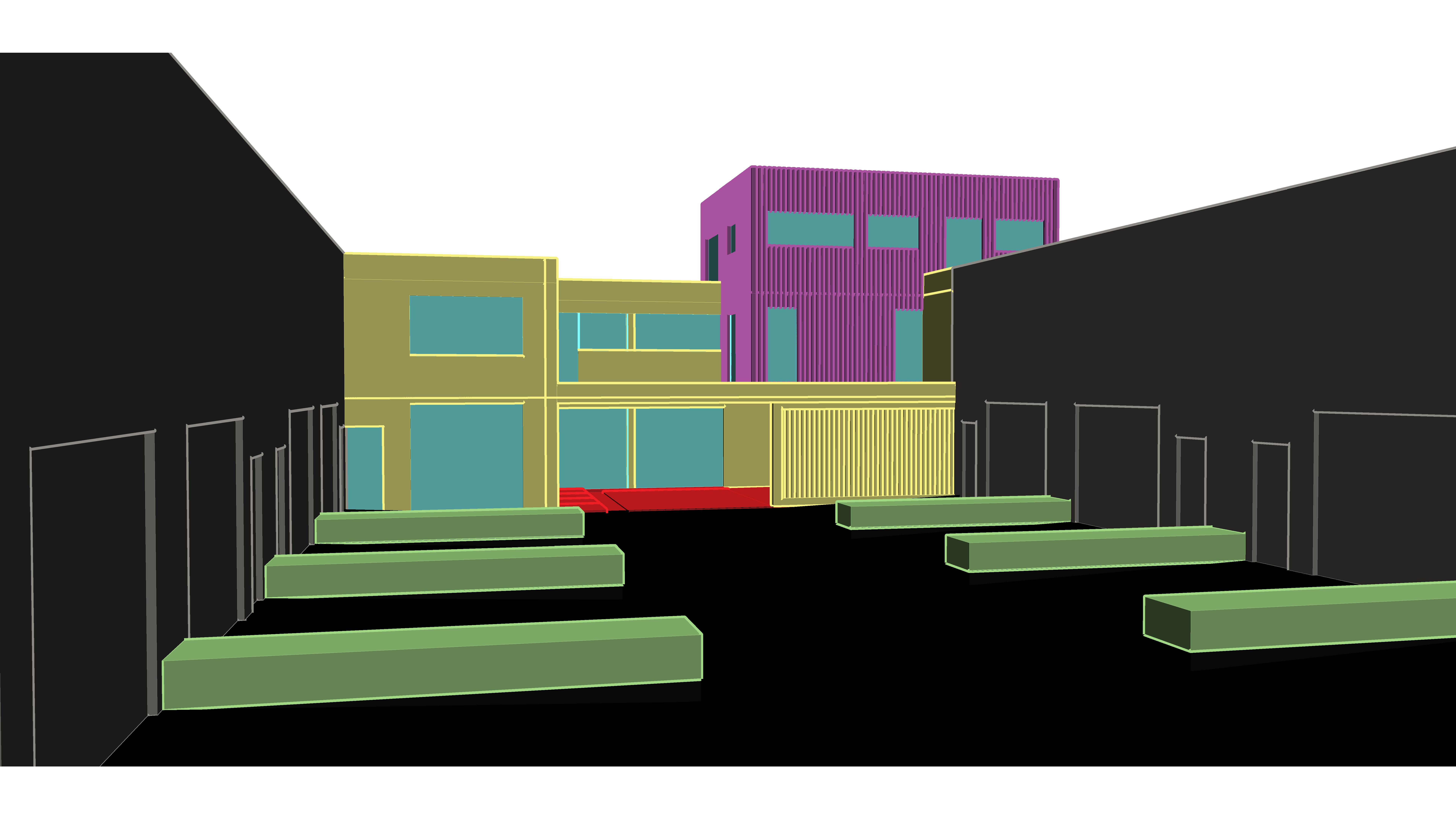 industrial building facade green blocks are hedges blue is reflecting glas purple is wooden vertical structure yellow block is concrete