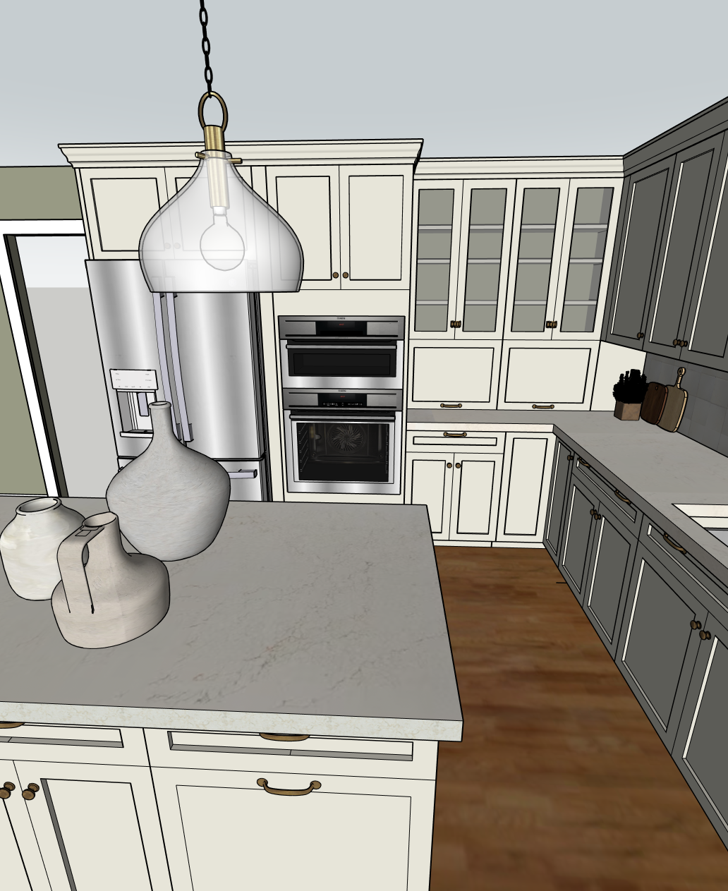 create a photo realistic rendering of my sketchup kitchen design add ceiling with recessed lighting