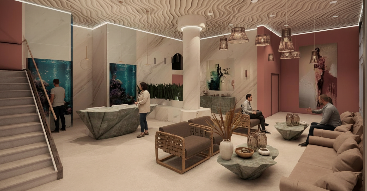 add a receptionist and decorative flowers on top of the reception desk that are tropical illuminate the fish tanks add white pillows on the brown couches