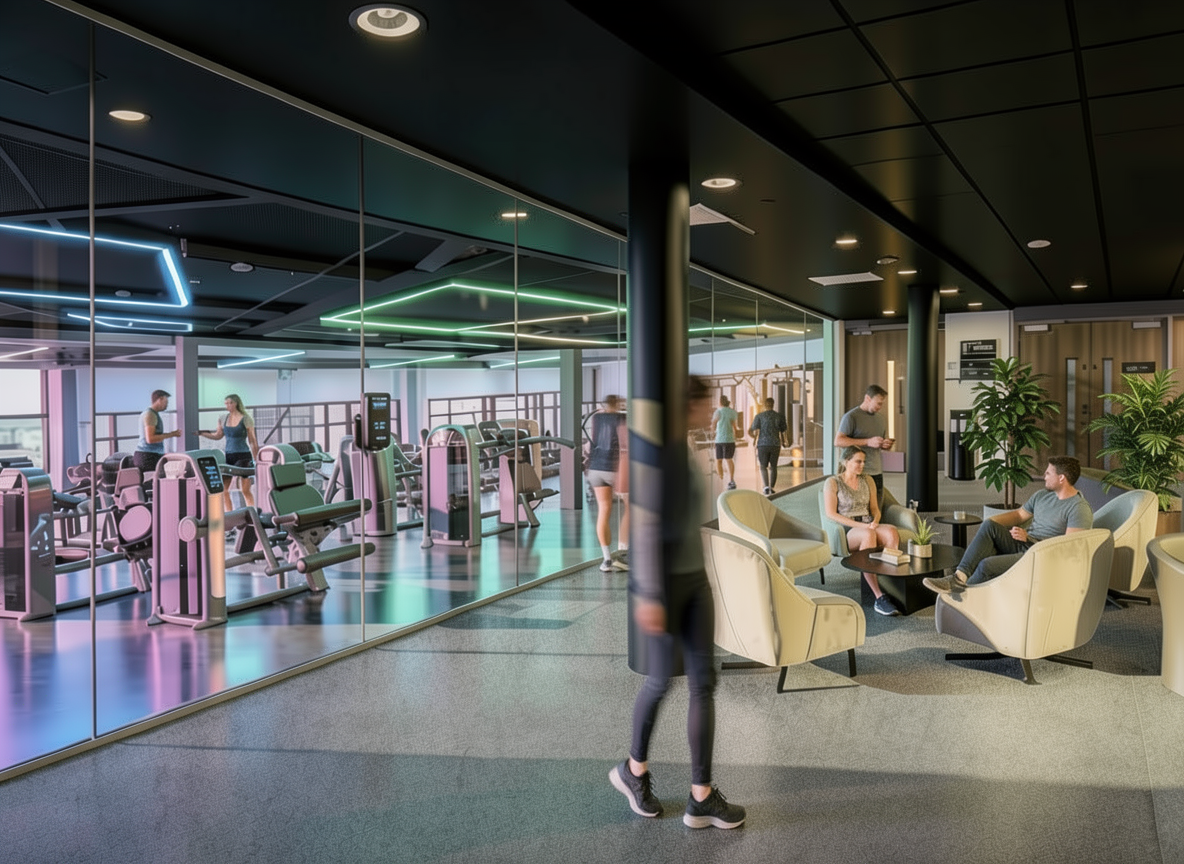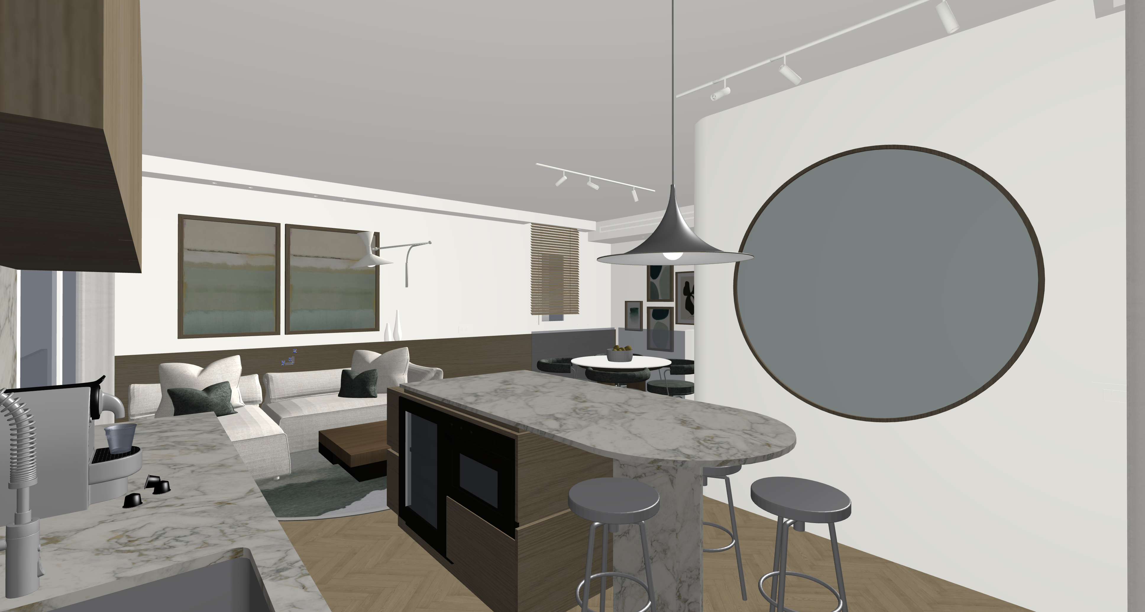 zona cucina con piano in marmo venato e una strip led sotto i pensili l isola della cucina ha una lampada a sospensione cromata ed accesa gli sgabelli sotto all isola sono cromati le pareti sono tinteggiate di bianco a soffitto abbiamo un binario bianco con faretti bianchi accesi con luce calda sopra al tavolo e uno sopra allo specchio tondo le sedie del tavolo sono verde salvia scuro dietro al tavolo abbiamo un parapetto in vetro trasparente lo specchio tondo di fronte all isola della cucina riflette parte della cucina e la portafinestra con vista mare sopra al divano abbiamo quattro faretti ad incasso accesi che illuminano i quadri i faretti sono due per ogni quadro a fianco dei quadri abbiamo una lampada a parete bianca accesa dietro al divano la boiserie bassa in legno rovere naturale ha una strip led incassata nella parte superiore che emette luce verso l alto metti una strip led dentro alla veletta della tenda a veneziana in legno fai entrare un p di luce naturale dalla portafinestra alle spalle dell immagine c un altra portafinestra che fa entrare della luce naturale e illumina l isola della cucina metti qualche oggetto di una zona cucina e nella zona giorno