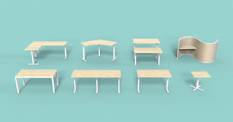 create an image of a modern office furniture set featuring various minimalist desks and a curved privacy pod all with light wooden tops and sleek white legs the background should be a soft pastel turquoise creating a calm and serene atmosphere ensure the lighting is soft and even highlighting the clean lines and contemporary design of the furniture giving a sense of elegance and functionality