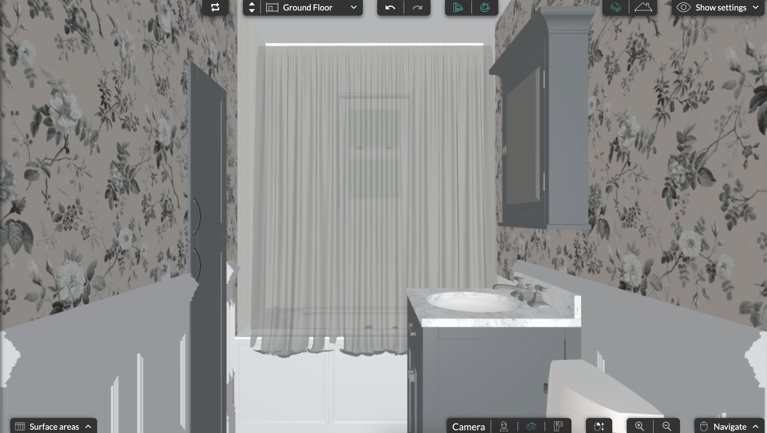 the wallpaper is cream with blue florals the natural light should be a little less harsh and cooler the vanity and mirror are a bluegray color