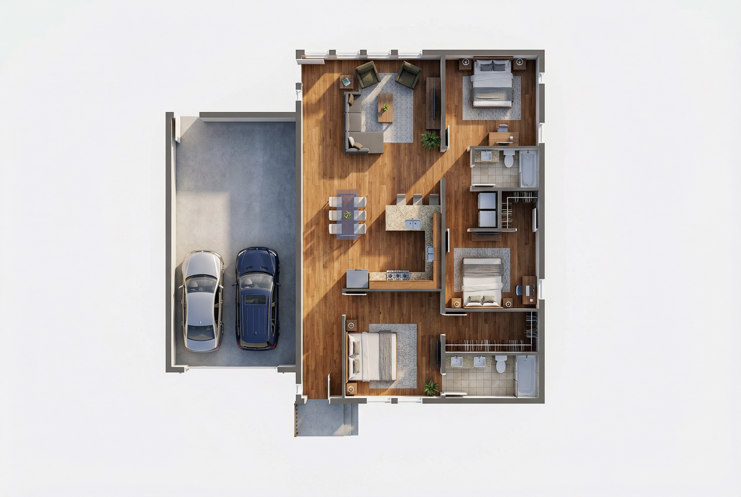 black roof daker warm grey siding and paneling with stone work along the bottom following the land simple landscaping and a smaller paver road along the front