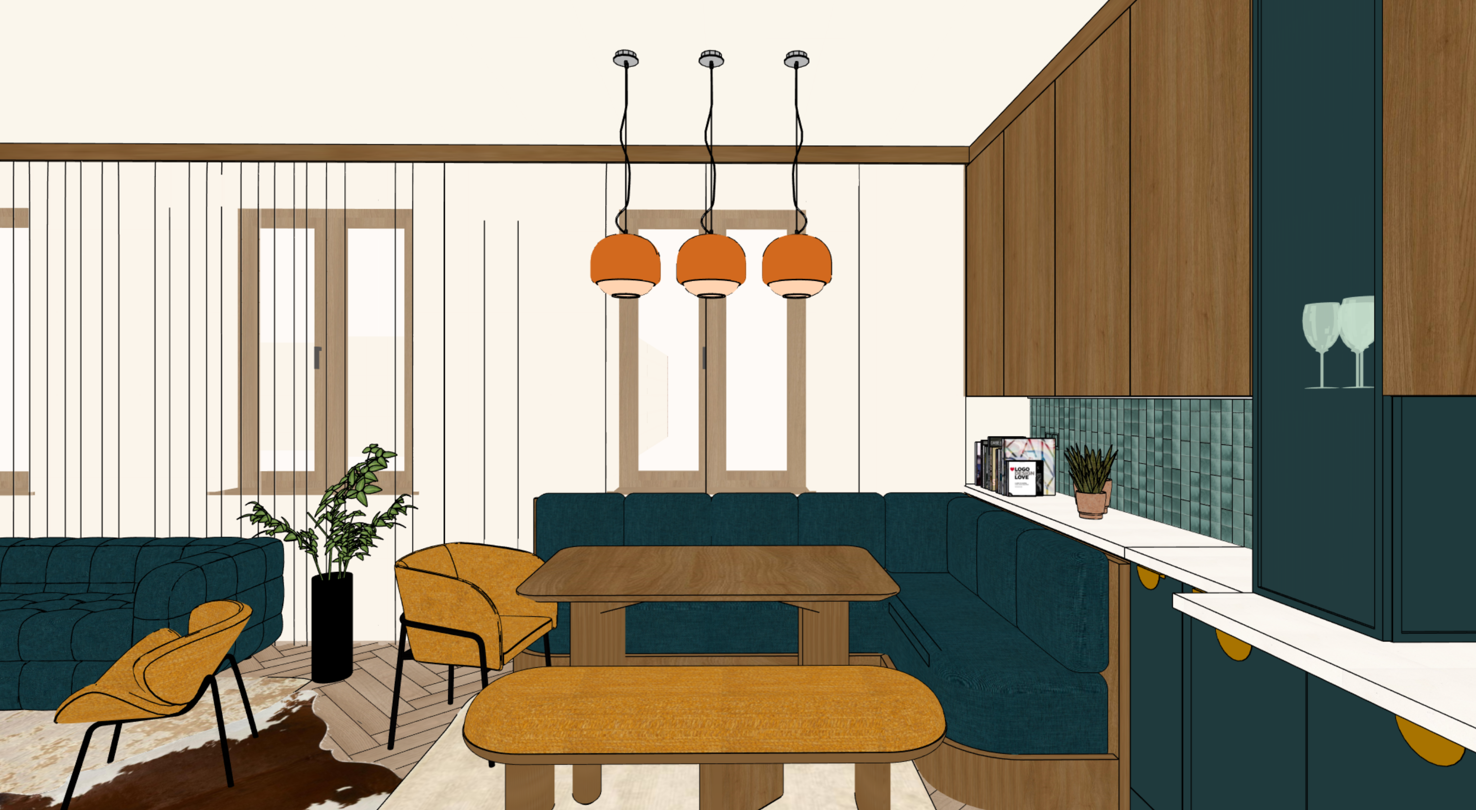 dining nook with bright colors and a soft upholstered corner seatee wooden sculptural dining table sculptural upholstered bench with a mustard color fabric cream colored soft area rug sheer curtains are closed above three spaceage orange pendant lights emmitting warm light lots of bright daylight pouring in from the windows through the closed sheer curtains kitchen cabinets on the right with mustard color ikea begripe handles teal organic tile backsplash quartz countertop the teal tall upper cabinet has a fluted glass door