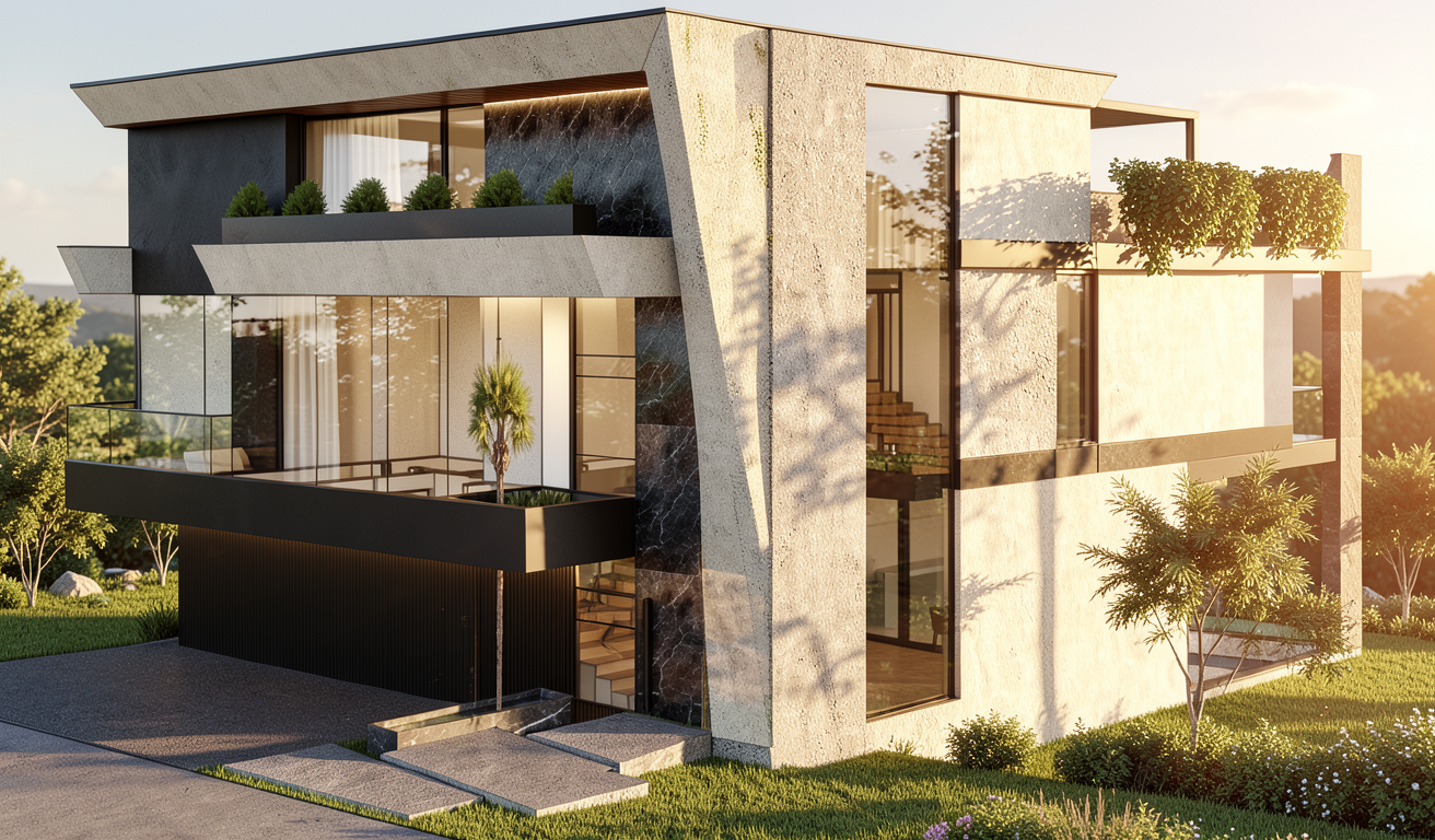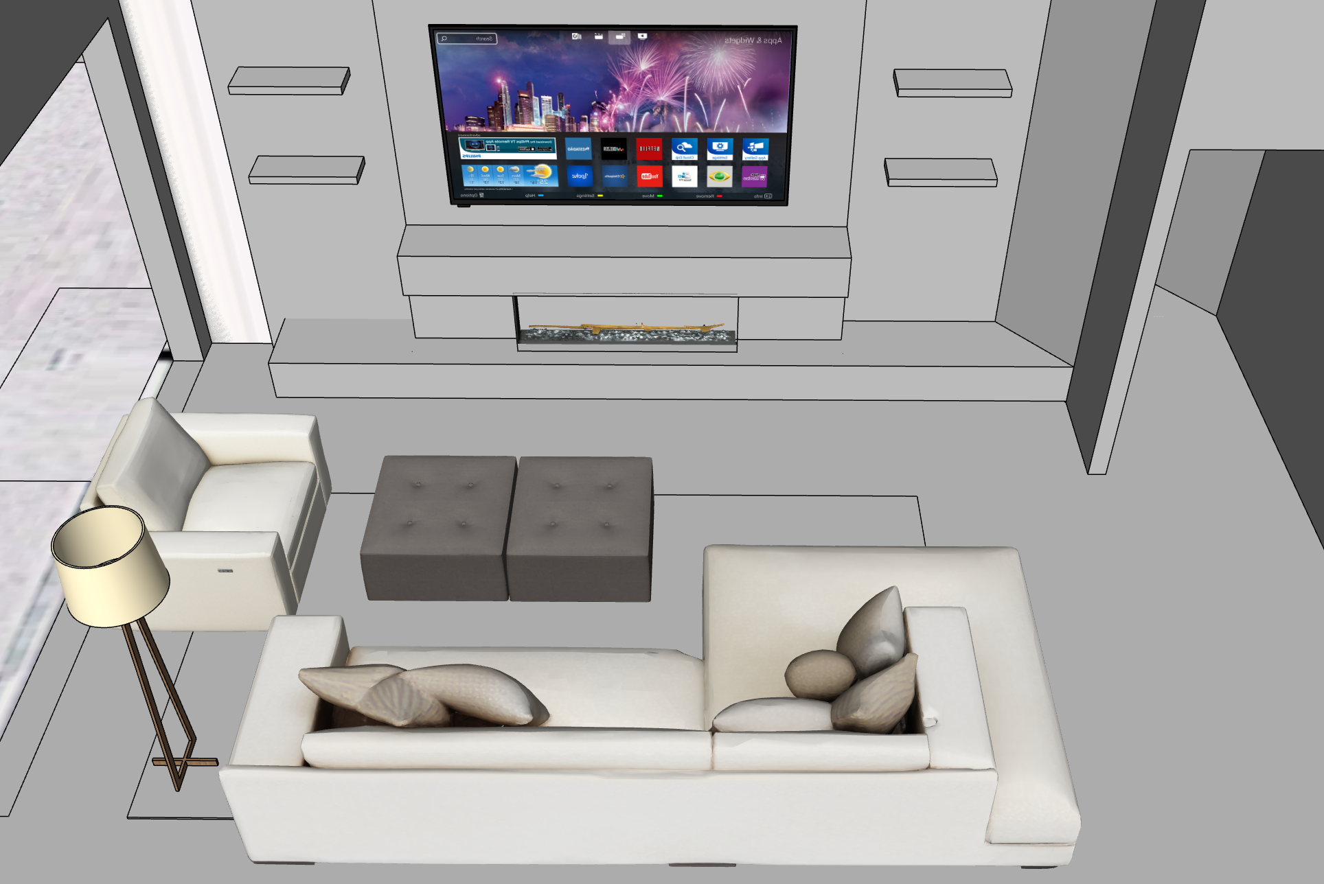 photorealistic contemporary living room interior maintain the exact existing footprint proportions and furniture placement no design changes add accessories on floating shelves floor to ceiling neutral drapery on the left side with soft natural folds warm organic modern palette sand beige warm white and natural wood