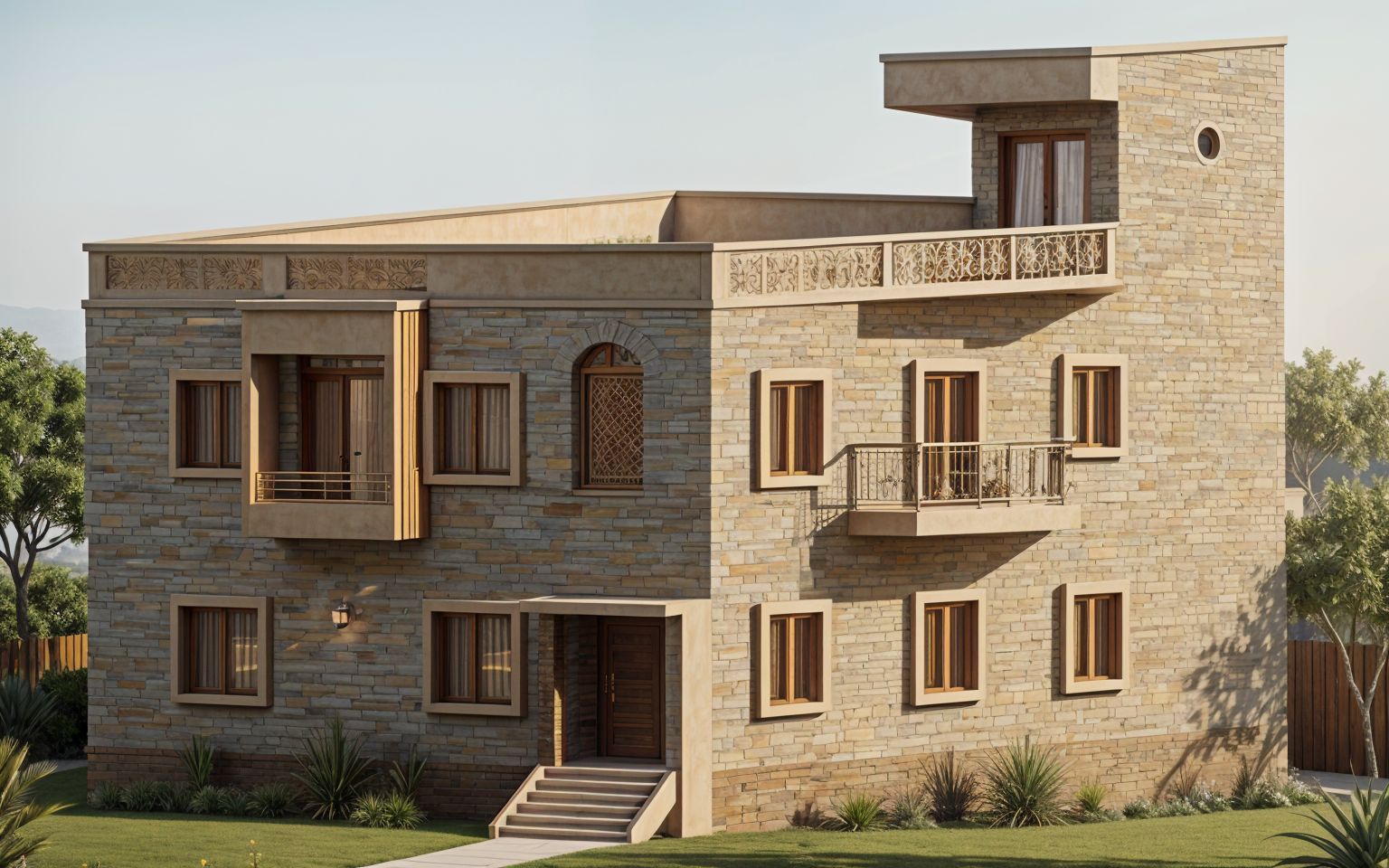 generate a modern g 1 house with integrated greenery add vertical green walls creeper supported ss grid panels balcony planters and terrace garden use natural materials like stone and wood with neutral colors soft daylight fresh and eco friendly ambiance