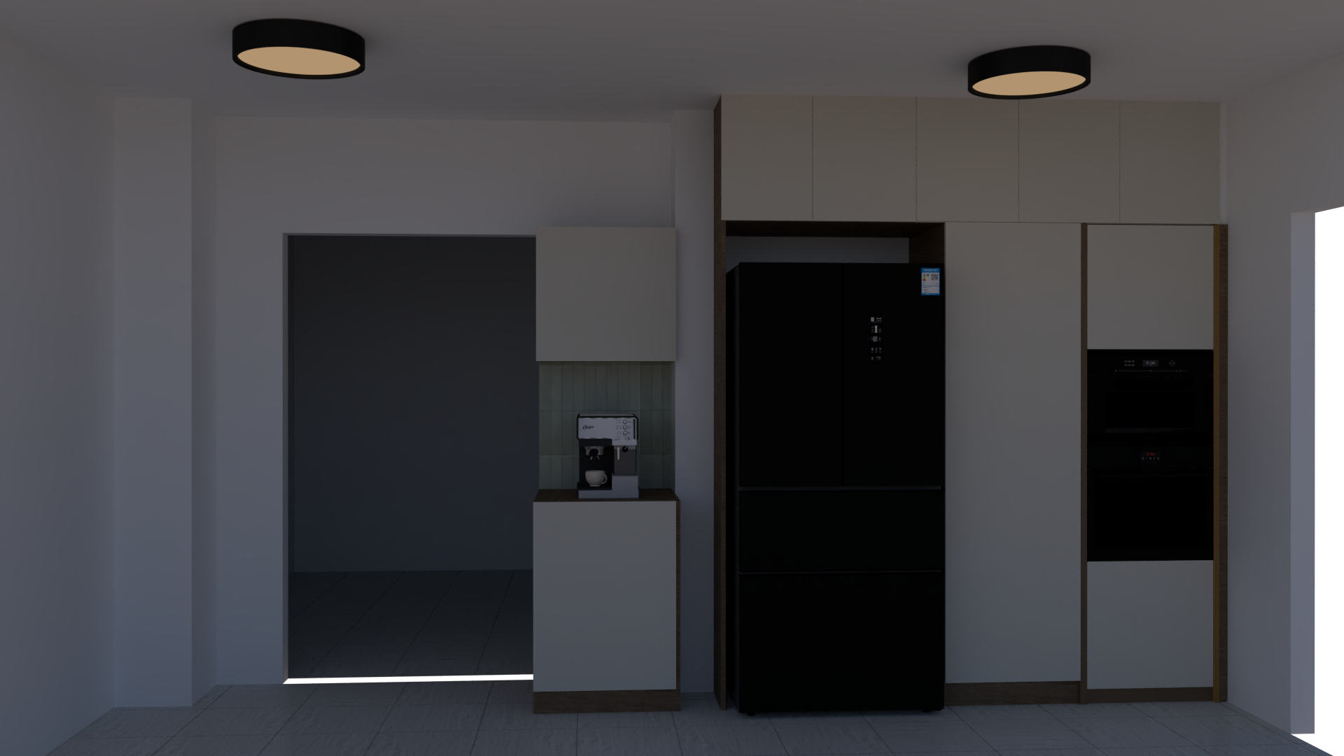 exterior shot a modern kitchen interior with a sleek and elegant design use a neutral color palette matte black appliances soft beige cabinets and dark wood accents the walls should be crisp white and the floor should be light white tiles add a touch of warmth with soft ambient lighting from the ceiling and create a sophisticated atmosphere highlight the textures of the cabinet surfaces and the polished appearance of the appliances with a gentle reflection on the countertop the counter top would black granite with reflective surfaces