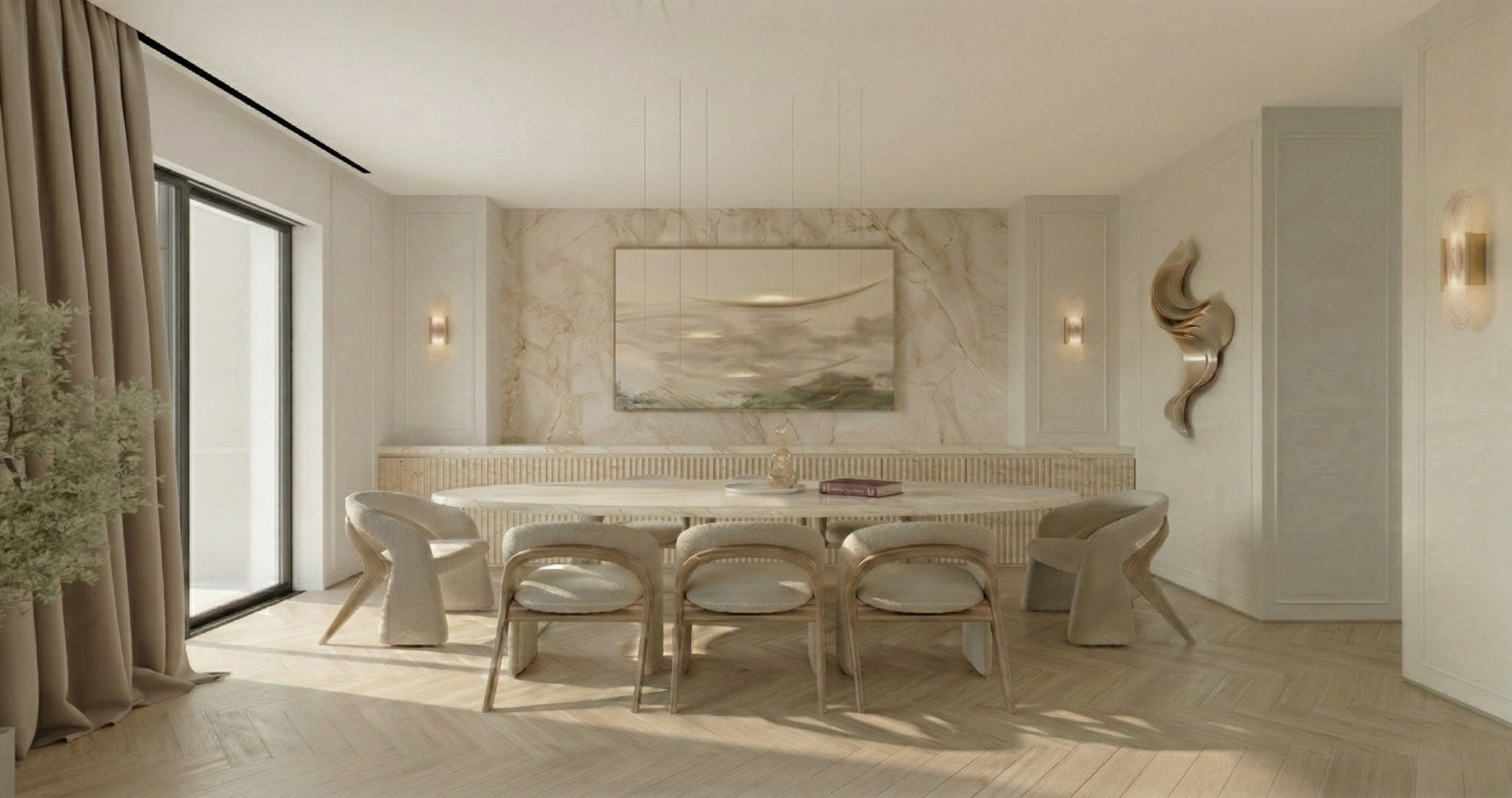 take this semi final render and enhance realism without altering any of the current image s geometry features or objects as well as image orientation no cropping zooming etc final result must be 4k do not add any new objects keep the herringbone pattern exactly as is but increase the tonal variation between individual planks each stave should have a distinct natural shade ranging from light sand to muted beige change the surface to an ultramatte raw timber texture with visible open grain removing all artificial sheen or plastic like smoothness the goal is to see a clear organic contrast in color from one tile to the next emphasizing its wooden nature yet making the effect visible yet delicate and so it doesnt stand out too much the goal is for the change from the original to be subtle as for the marble waters and materials in general we re aiming to make them clear but without loosing the softness and sophistication of the composition so no harsh contrasts or saturation light should be kept as is end goal elegant high res 4k architectural visualisation upgrade in resolution from original should be able to be presentable to a client in terms of resolution