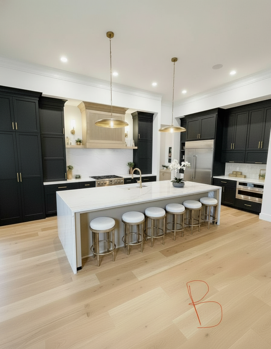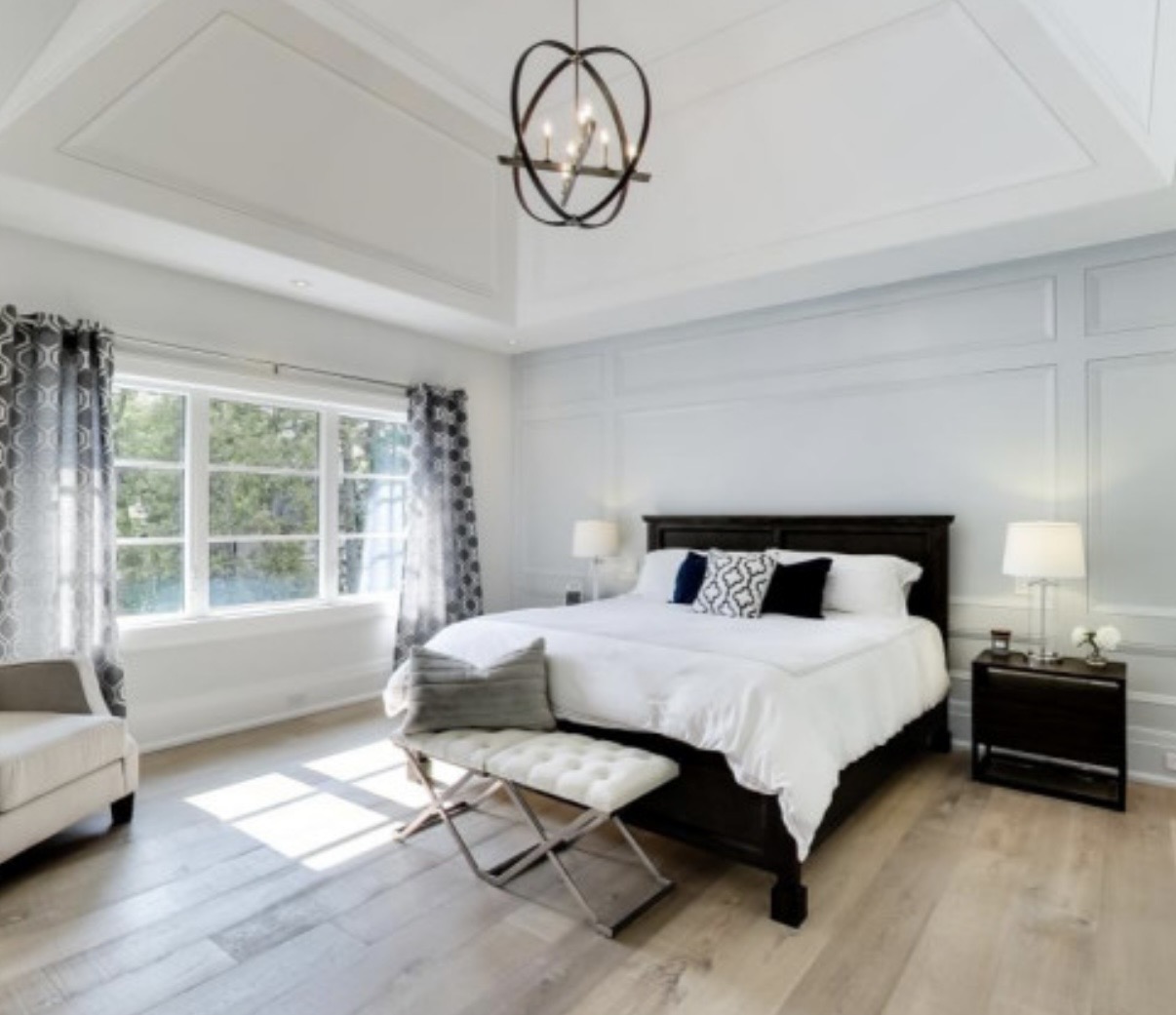 change the walls to a soft light pink change the chandelier to champagne and crystal change the flooring to soft white colored carpet make the bed frame and nightstands white make the curtains white take the black pillow off of the bed