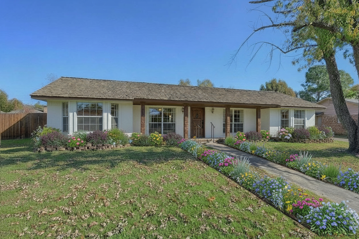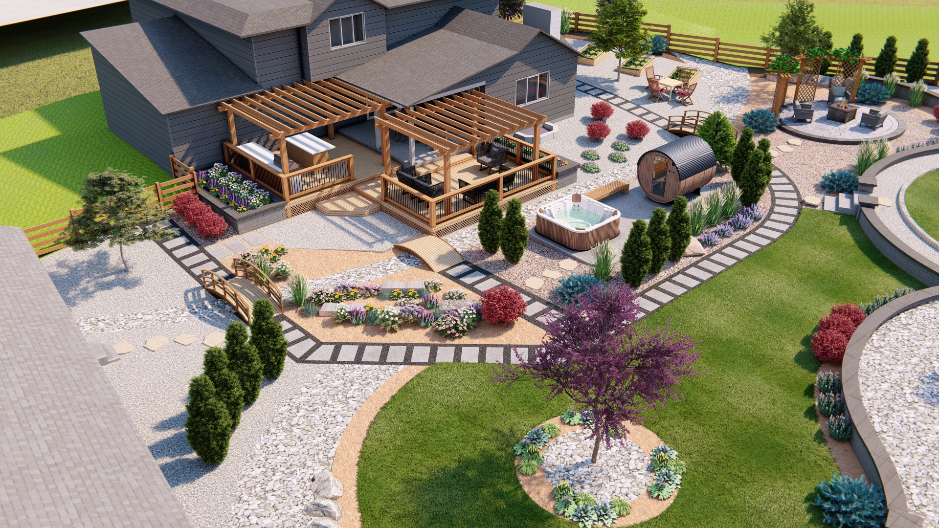 high end drone architectural photography of a luxury backyard strictly preserve the original layout house and structures enhance materials white cedar barrel sauna with detailed wood grain and natural knots large areas of variegated natural river rock gravel and black crushed granite with high detail textures lush deep green lawn with realistic grass blades cedar pergolas and wooden bridges with authentic timber texture lighting natural bright daylight powered by a high fidelity hdr sky soft global illumination and ray traced soft shadows 8k resolution photorealistic finish sharp focus on all landscaping elements