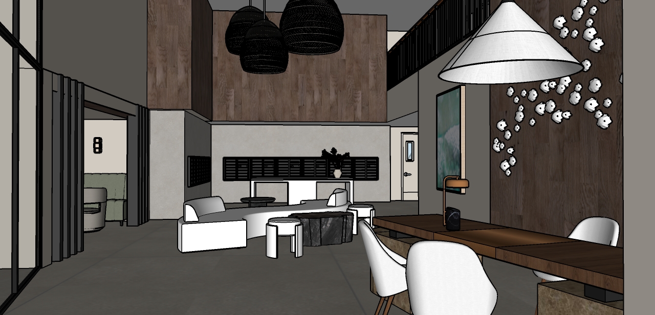 render as hand sketch no color except for wood walls give very slight texture and very light tone