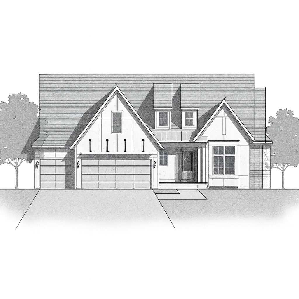 convert this black and white 2d architectural elevation drawing into a photorealistic rendering of a modern craftsman style home apply exterior finishes and colors to match the reference house muted green shingle siding light stone accents on the lower portion cream colored trim and black framed windows and doors use a dark charcoal roof with dimensional shingles add a clean concrete driveway leading to dark gray garage doors with simple rectangular windows include a fresh green lawn small landscaped shrubs with rock edging and one young tree in the yard ensure realistic textures natural daylight and a bright blue sky with light clouds similar to the reference photo architecture