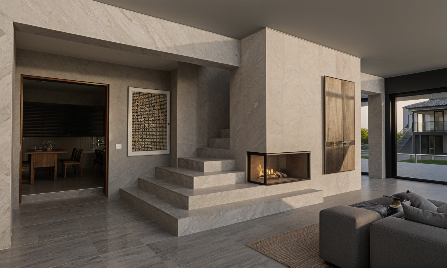 make look realistic add natural lighting make daytime make daytime add furniture and lighting fixtures wood floors the kitchen is enclosed with a nice backsplash tile keep the furniture together there is a marble table behind the couch on the left the coffee table to match