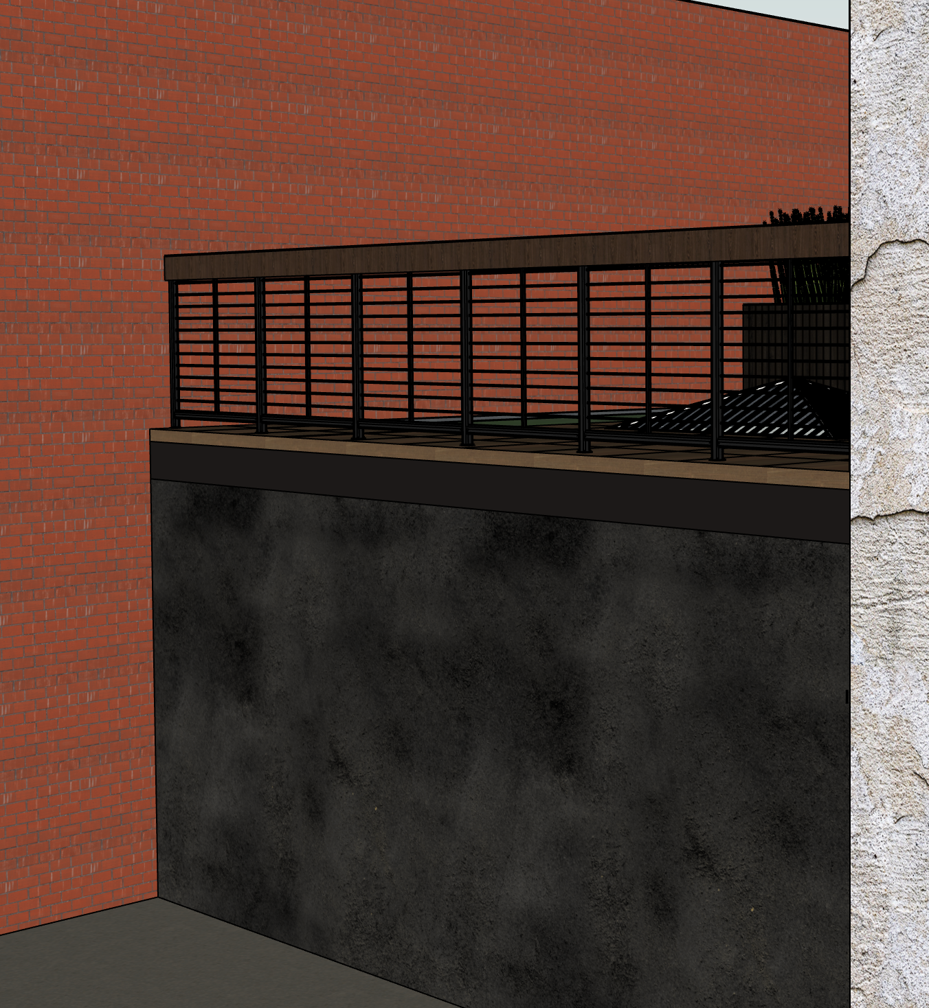 below the railing is an black building railing is black steel with cable railing and a walnut wood stain top rail