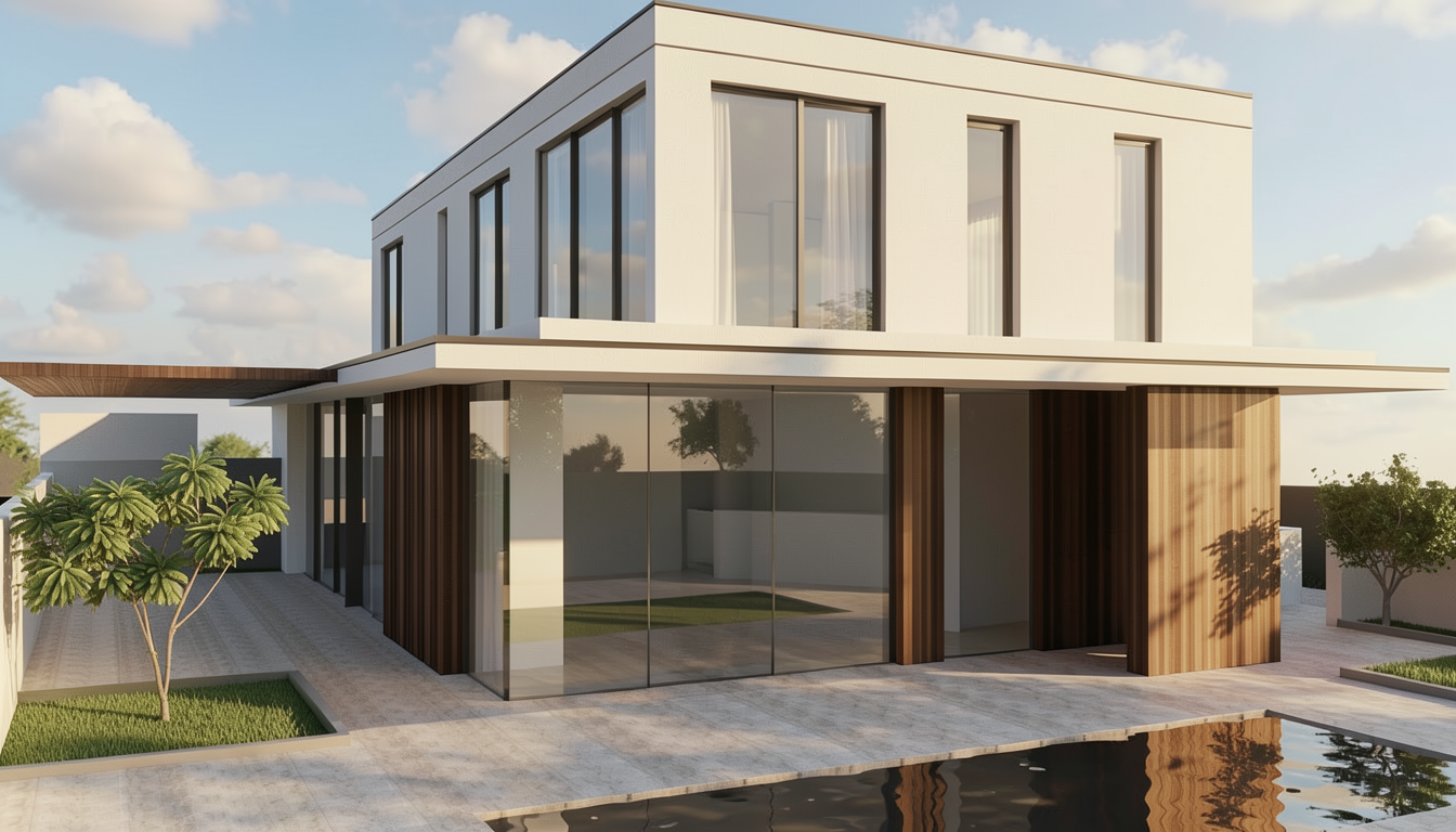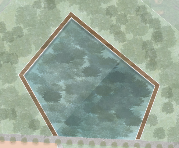 fammi un render come se fossi un uomo che cammina sulla passerella in legno di questo raingarden e aggiungi dettagli come piante e molte alberature intorno alla passerella