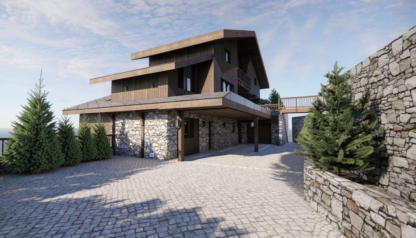 modern luxury hillside villa in tolo greece viewed from a lower eye level angle showing the entrance architecture contemporary minimalist villa with curved and cantilevered slabs large glass fa ades warm interior lighting is on fully furnished interior visible through glass living room sofas dining table modern furniture landscape natural green lawn dominates the site a few mediterranean trees such as olive trees and cypress trees placed organically no gravel no rocks no dry landscape ighting atmosphere golden hour sunset warm luxurious lighting cinematic sky soft shadows high end luxury villa atmosphere elegant and calm materials exposed concrete white plaster natural stone only on the building large glass panels style photorealistic ultra detailed architectural visualization real estate quality render global illumination