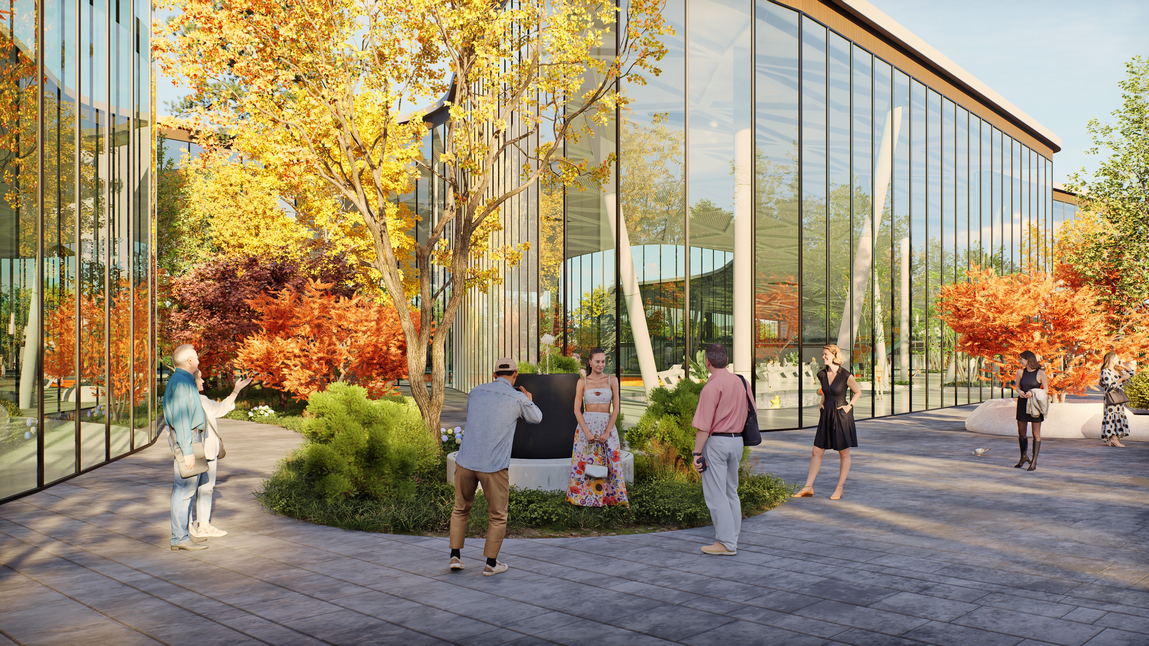 important preserve the existing geometry and the existing context exactly as provided preserve the existing windows do not add new windows do not modify alter reinterpret add remove scale or reshape any geometry do not change the site surroundings street layout neighboring buildings vegetation or context elements do not modify geometry scale proportions buildings road layout sidewalks or surrounding context in any way do not modify text soft noon atmosphere diffused neutral natural daylight with subtle cold tones cinematic architectural mood warm interior lighting 4000k glowing from inside creating slight contrast between cool exterior and warmish interior large glass surfaces with realistic reflections soft mirror effect environmental reflections of sky and surroundingsimportant do not add new windows remove the people