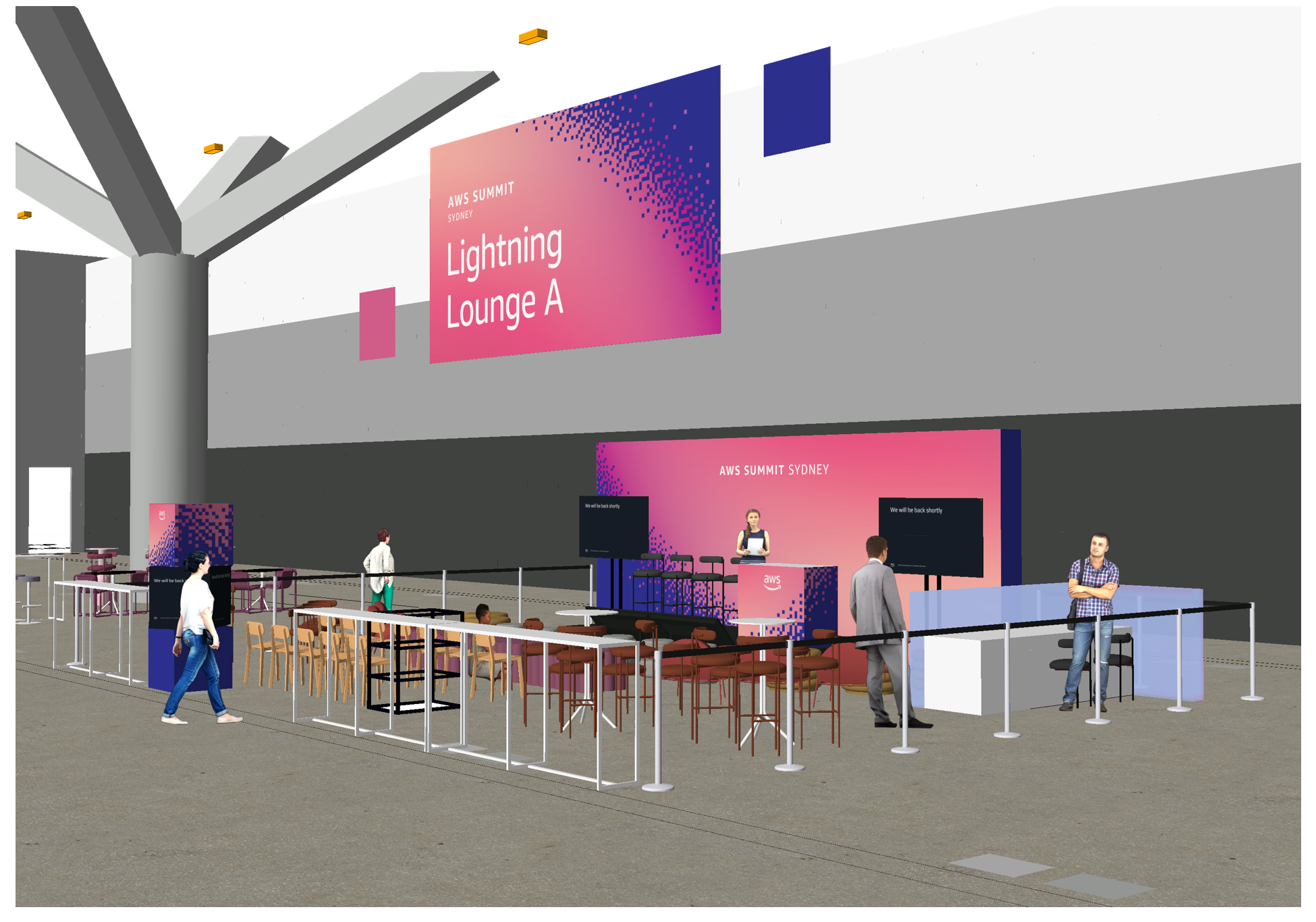 render this 3d model with realistic textures the context is an industrial expo location extremely dark space expos with soft pink lighting in the background with polished concrete floor ceiling with barely visible trusses with several bright pink lights led cube stacked boxes at the front blurred business people sitting to watch