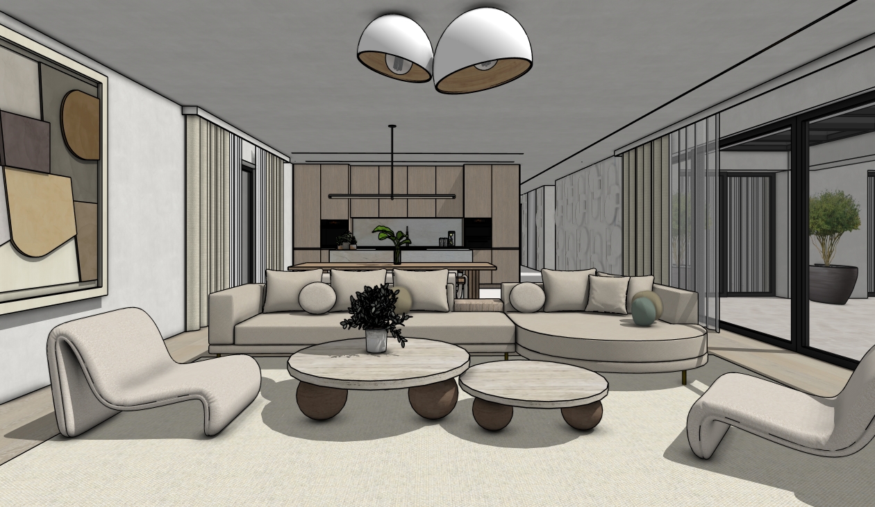 render with bright noon daylight add lighting to the lamps in the kitchen dinning table and on the ceiling linear led light