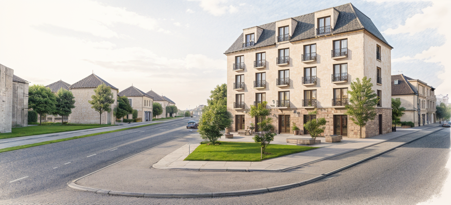 colonial revival exterior shot render a beautiful modern suburban house on a sunny day use a light gray siding for the house exterior with gray asphalt shingle for the roof and trim there is stone accents 3 from the ground floor walls the windows have molding the garage door has a glass lite on the upper portion and window frames should be white surround the house with lush green grass lawn with low lying native planting and one tree with a clear blue sky above add warm sunlight creating gentle shadows for a serene and welcoming atmosphere architecture