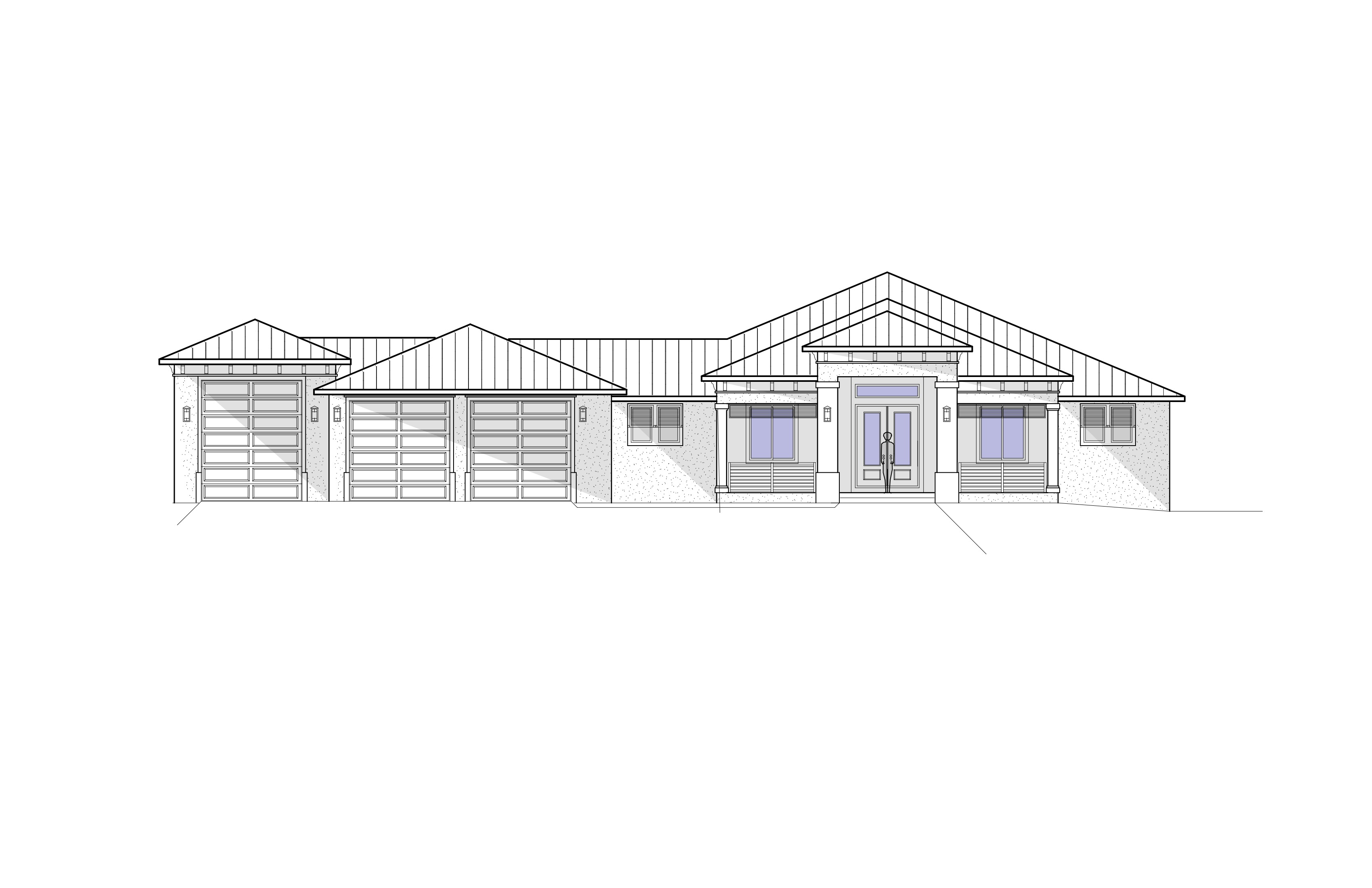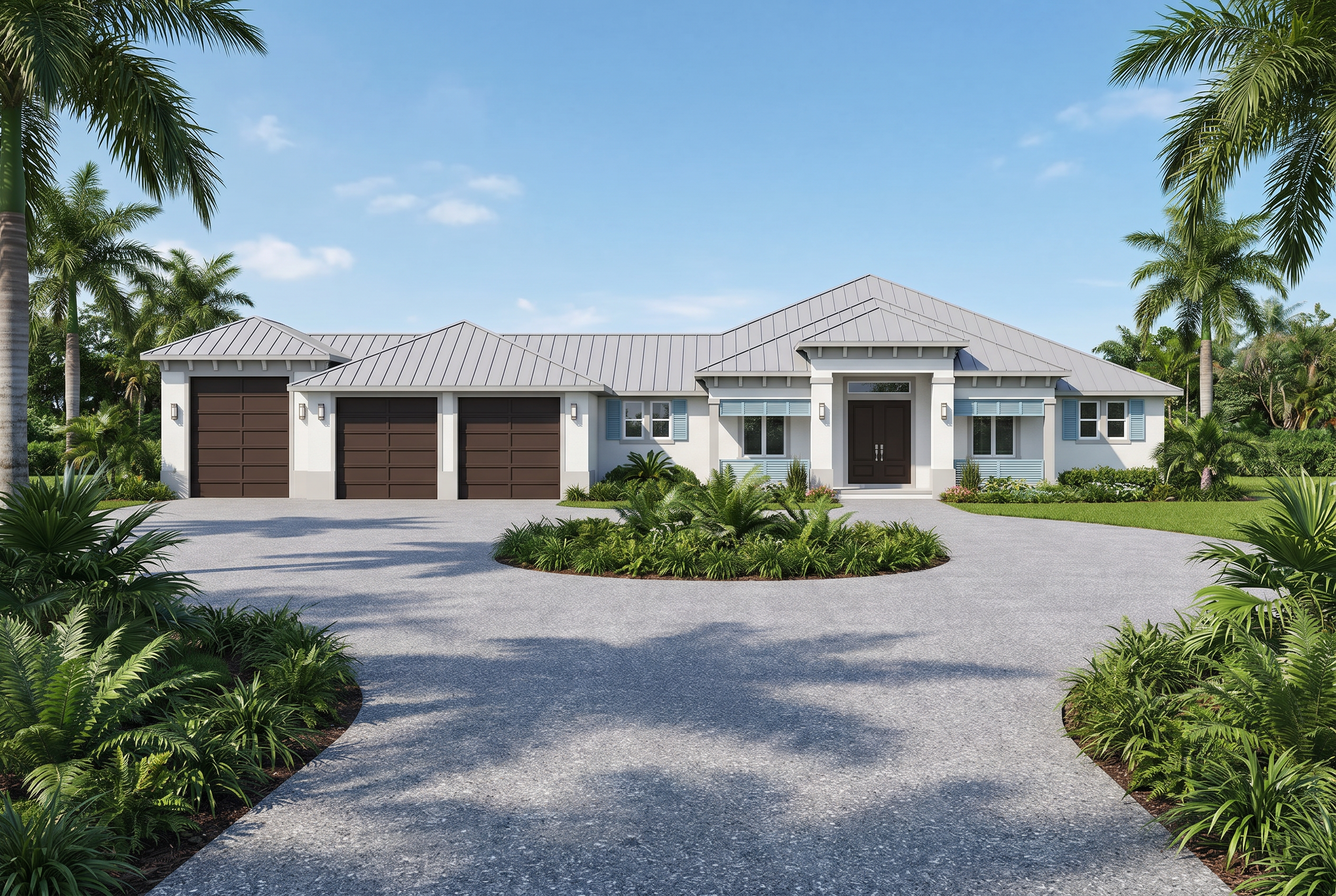 light gray standing seam metal roof light gray fascia and overhang white walls light gray banding light gray roof overhang corbles dark brown entry door dark brown garage doors white window frames white walls light blue bahama shutters white walls dappled gray circular driveway tropical landscaping entry columns 6 in front of house porches each side of entry 4 in front of house 2 garage doors 10 wide by 10 high 8 in front of house single garage door 10 wide by 12 high 7 behind garage with double doors window beside entry to have bahama shutters