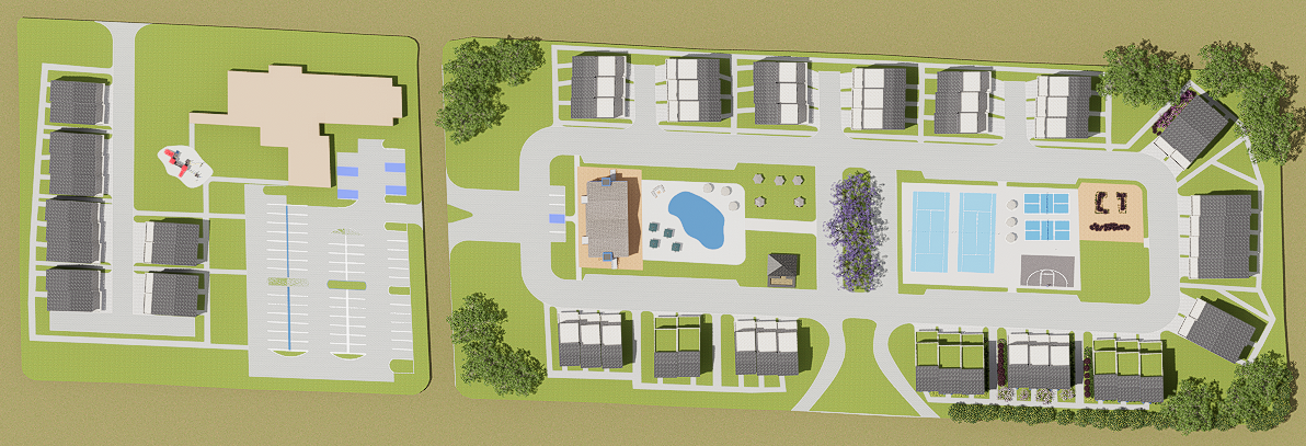 fully render the plan adding planting into the grass areas but not overdoing it leave the blue spaces in the parking lot alone make the blue in the center a pool but leave the blue tennis courts to the right alone