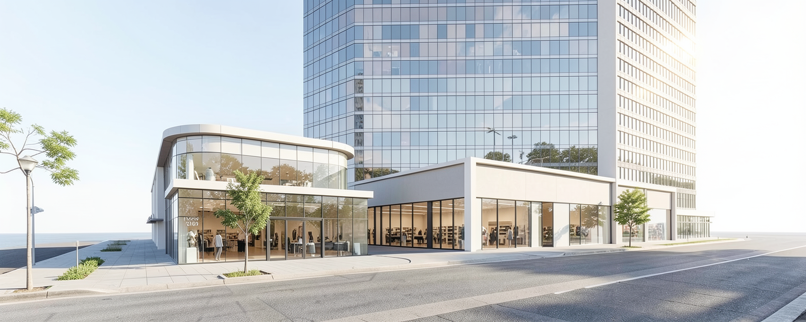 white background maintain mass add retail at ground floor on left mass only daytime view no cars