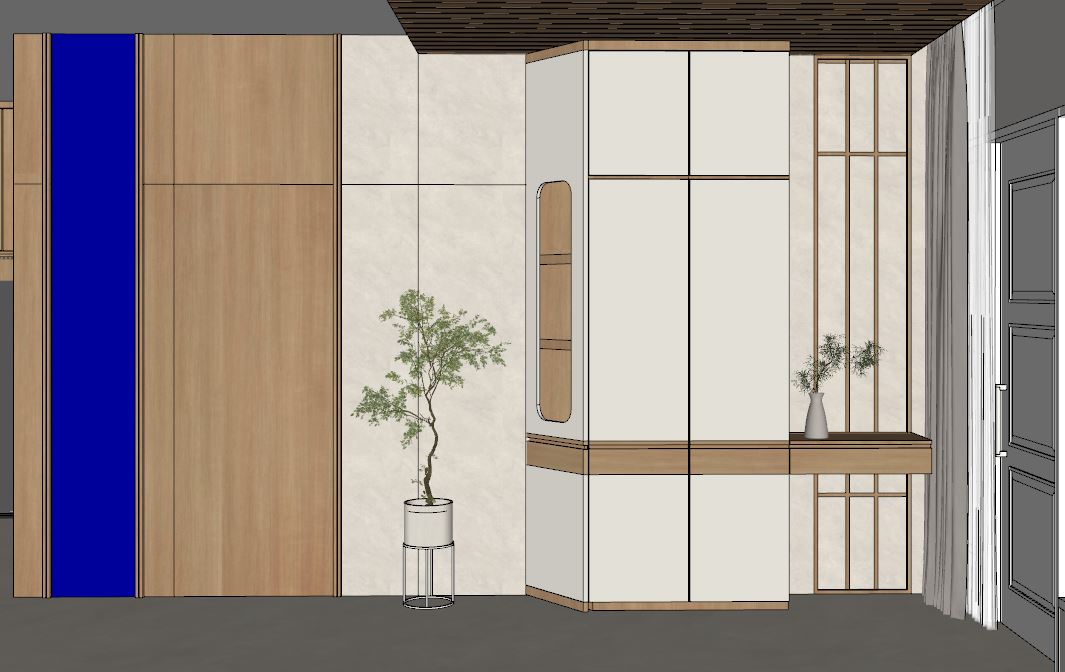 create an ultra realistic image from this jpg add ceiling spot lights use glossy soft cream stone textured to the floor and use warm off white for walls and the ceiling is white and add indirect light to the shelves add some decoration and add indirect light to the ceiling use soft stone texture for cream wall panel