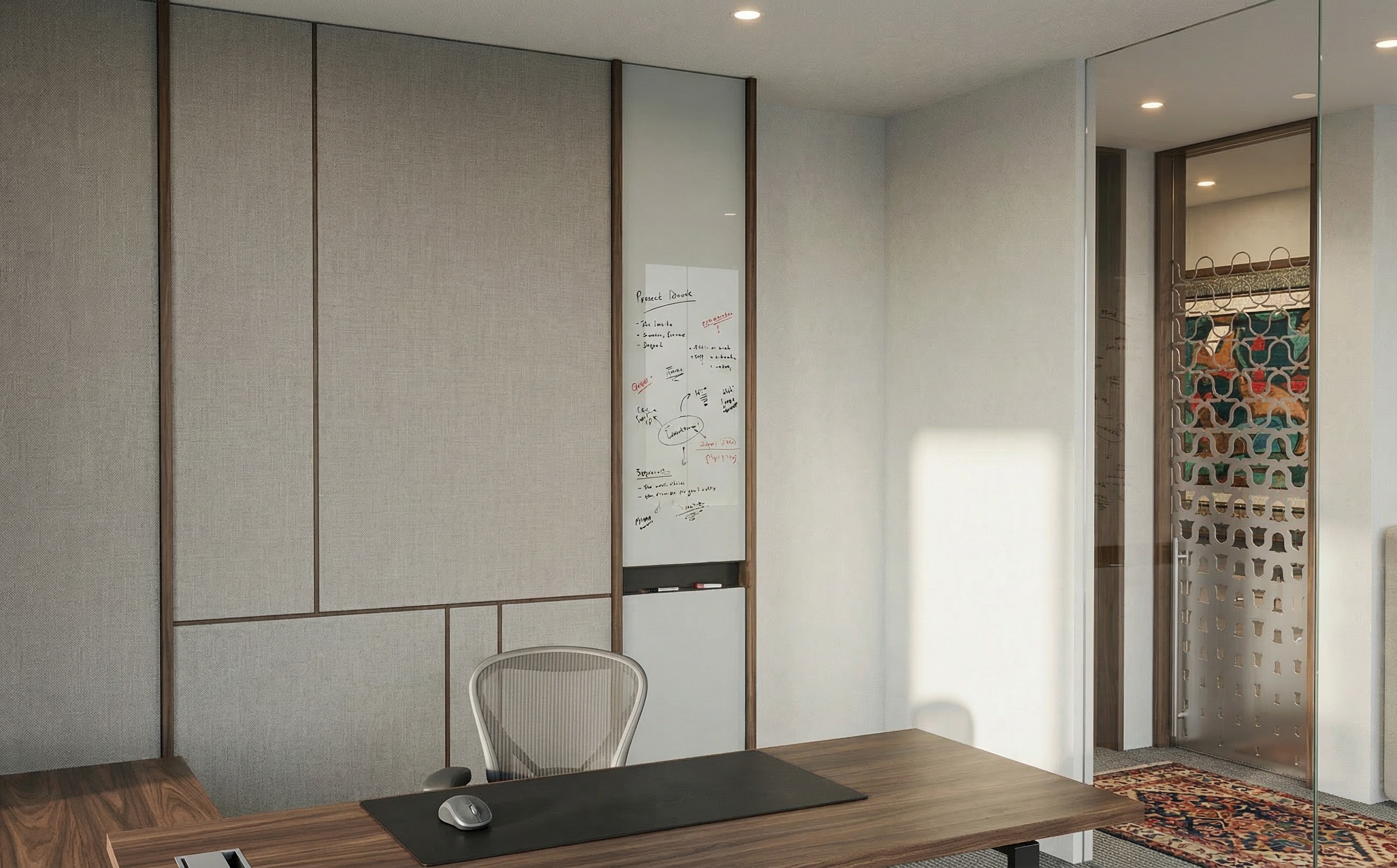remove the fabric texture on the wall on the extreme left panel remove arabic rug on the floor and replace the floor colour with a charcoal colour carpet