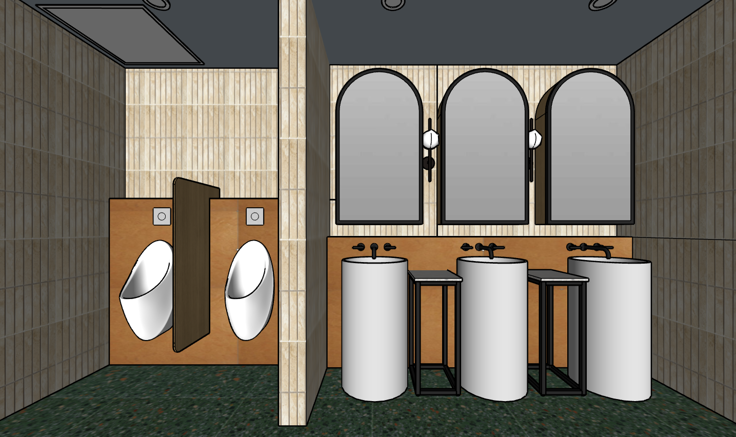photorealistic render with warm white lights the brown texture on the wall one are tiles