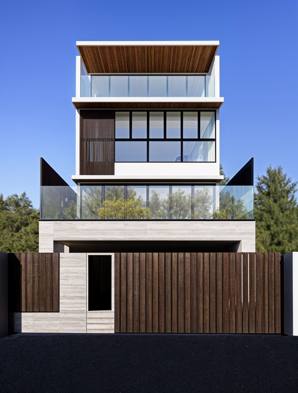 convert to a modern farmhouse style with black vertical board and batten walls and cedar wood window trims with california native landscape and trees in califonia sunset