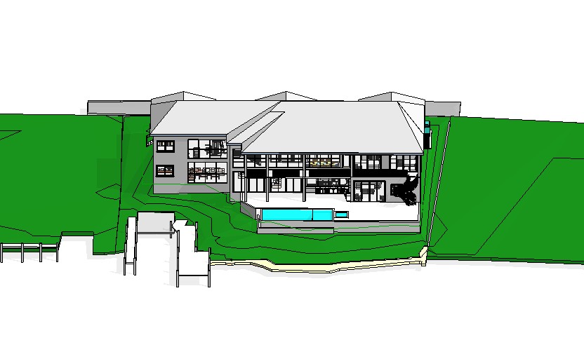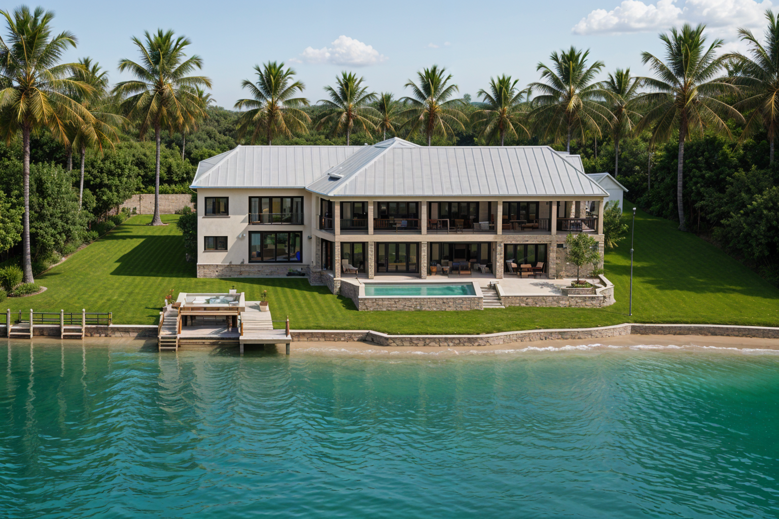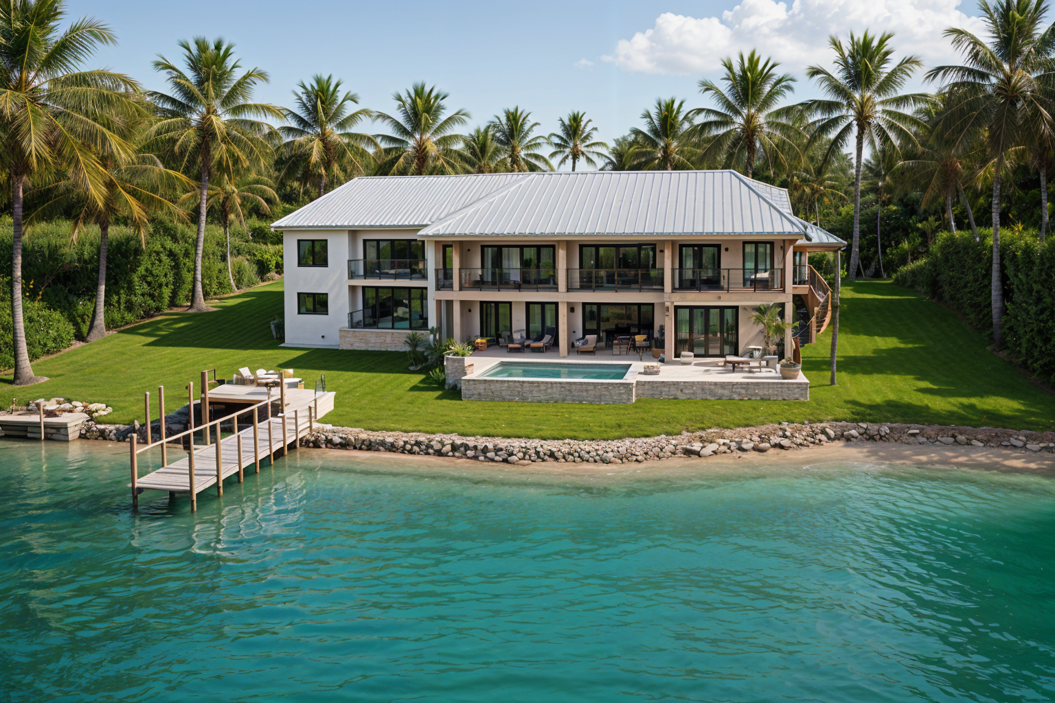 the home is situated on turquois bay waters that occupy all of the foreground that is shown in white with no beach the background behind the house is tropical hardwood and palm trees there is a dock shown on the left side the pool shown is infinity edge with spa next to it the walls of the home are light colored there is a coral stone facade on the lower level the roof is light colored metal there is a spiral staircase coming down from the balcony on the right side