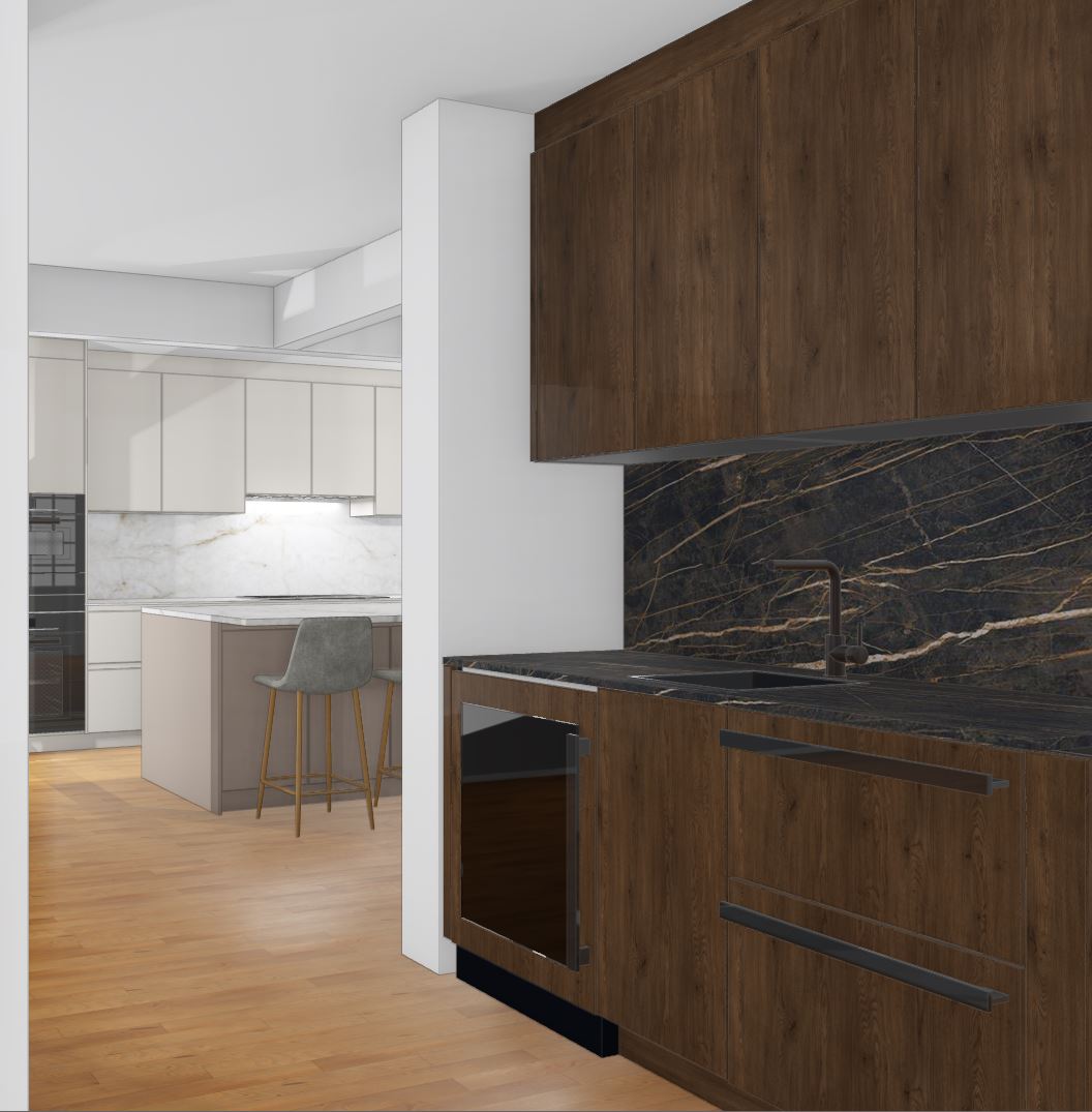 add bowl with green apples and pink peons on the island moody light sunny and foggy light from the windows cabinets in matte flat doors do not change cabinets nor add open shelves don t add new cabinets light under the wall cabinets