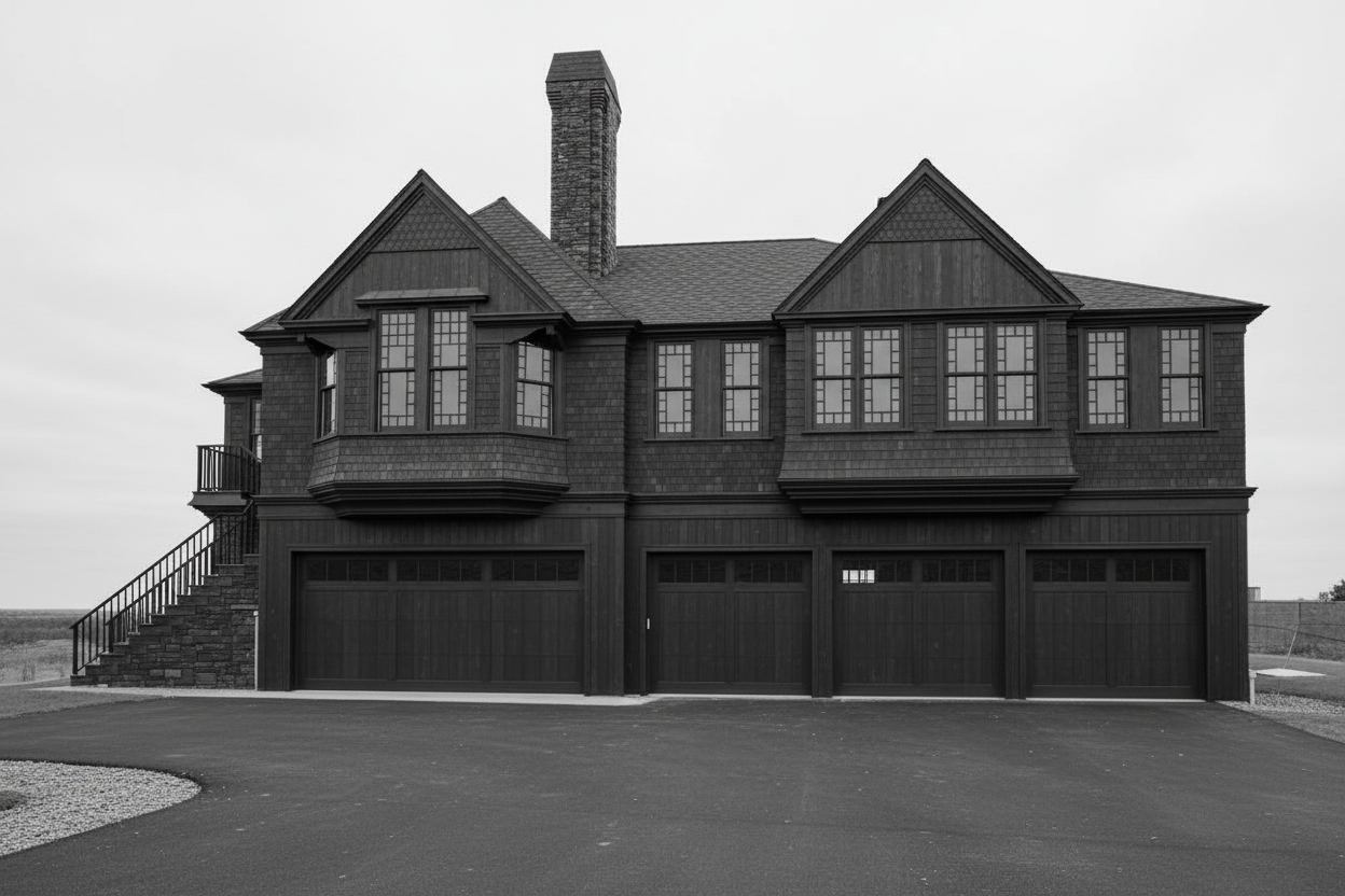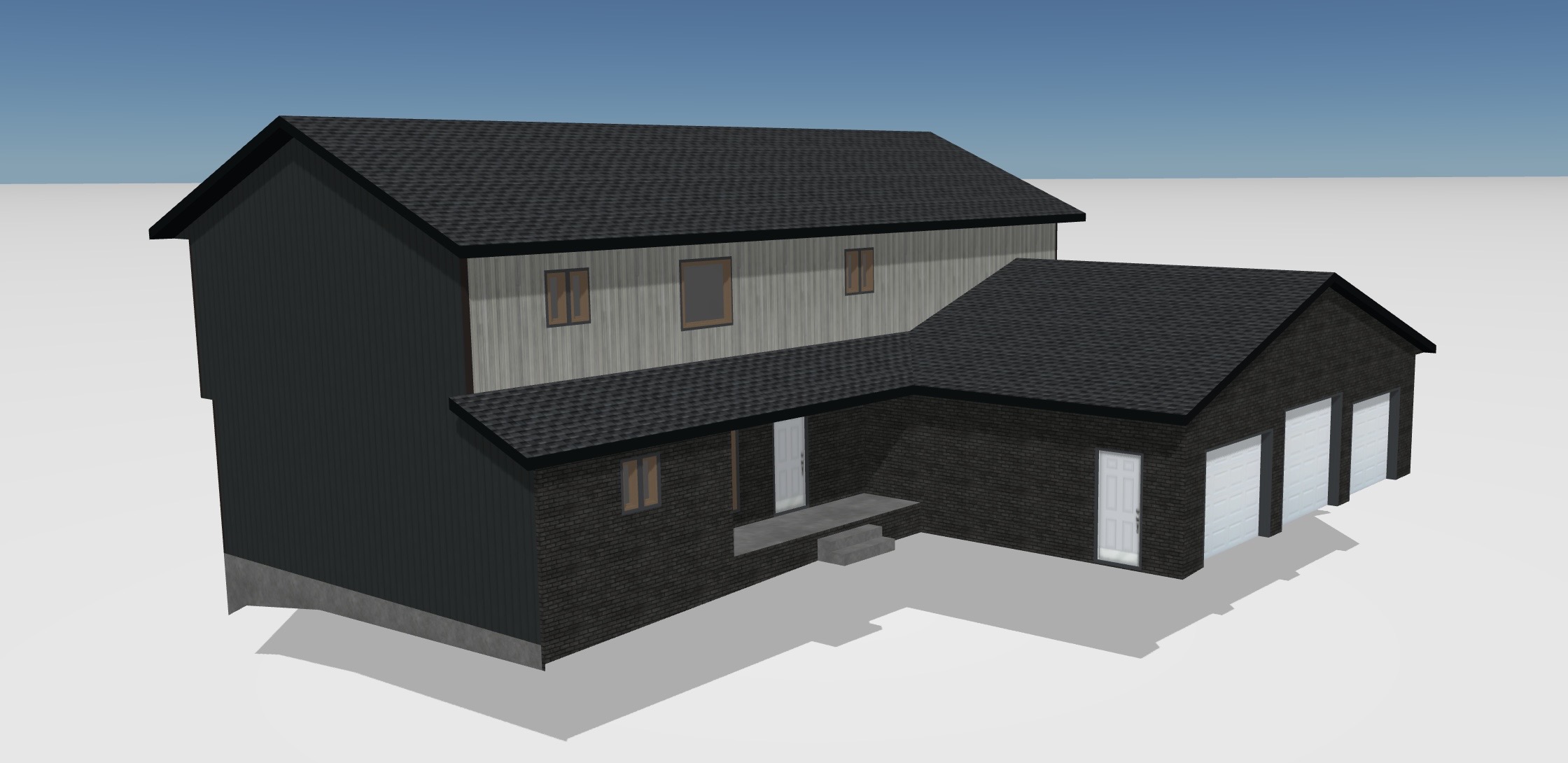 keep the shape and the color of the house the exact same put a deciduous wooded minnesota background on the image make the garage doors a cedar brown color keep the stone areas on the foundation of the house the same they are representing vera stone mission point code keep the brick as painted black