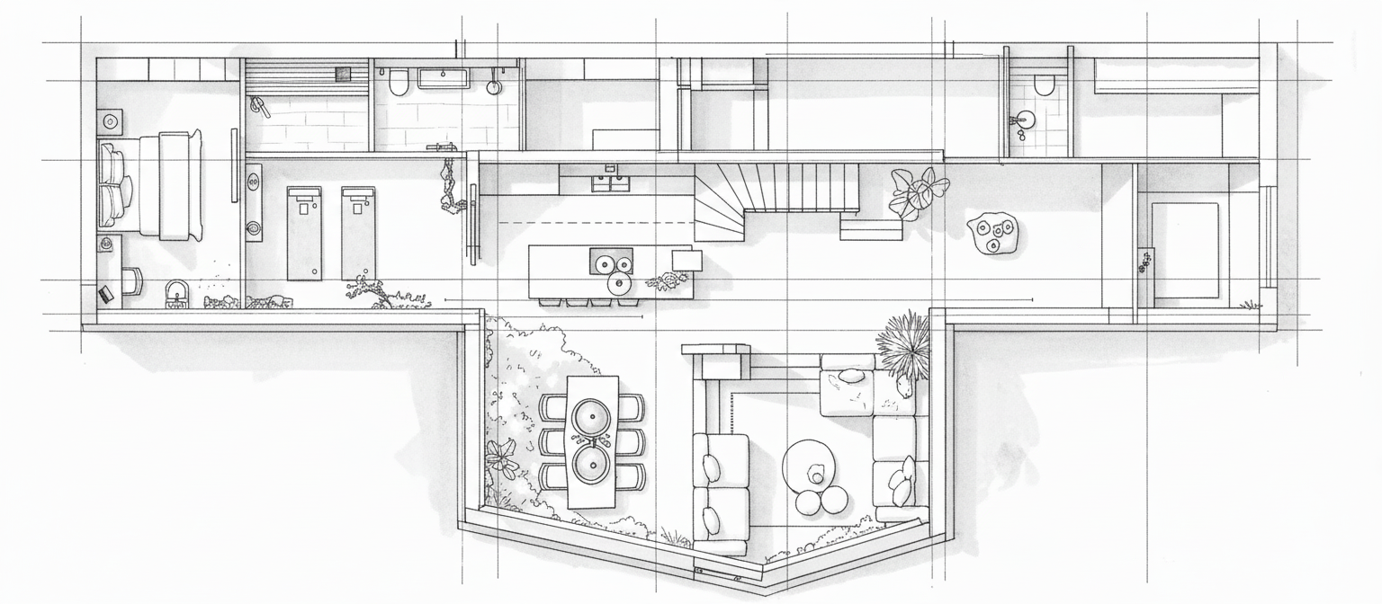 make it more like a hand sketch with only lightly indicated guide lines please in black and white and without plants at the dining table