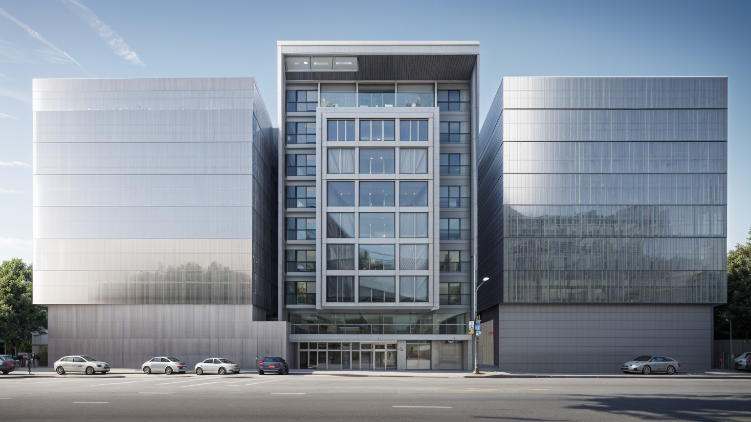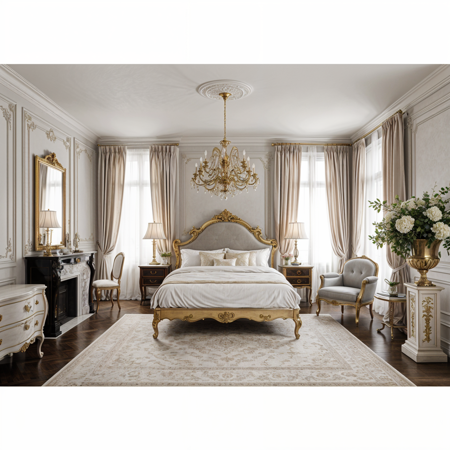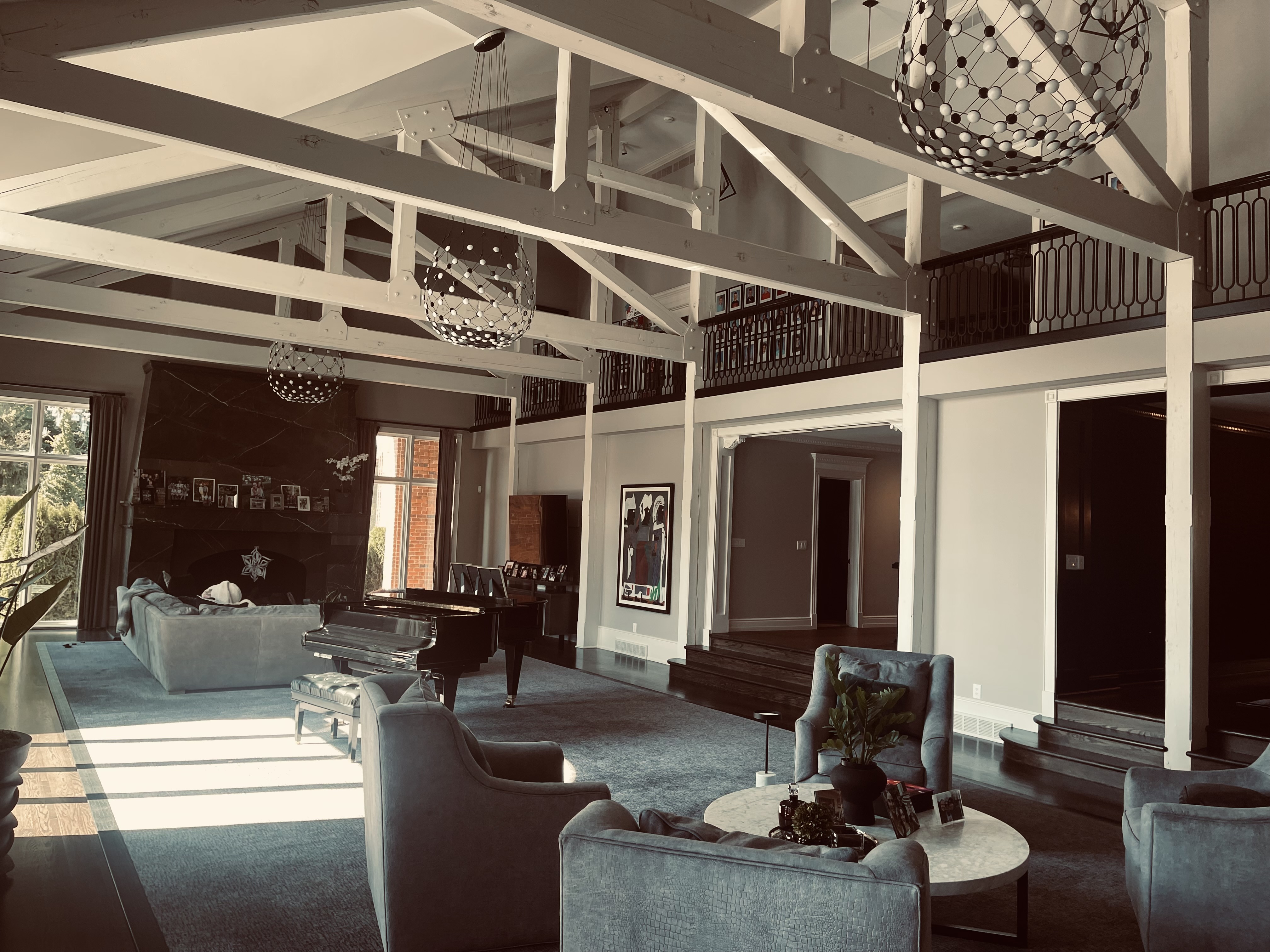 modernist interior shot light wood floor white walls wood ceiliing beams keep existing chandeliers change fireplace to a vertical fluted stone keep piano in middle add glass panel at opening with black frame keep railings and spindles black as is add black wrap to all opeings remove wall fireplace architecture