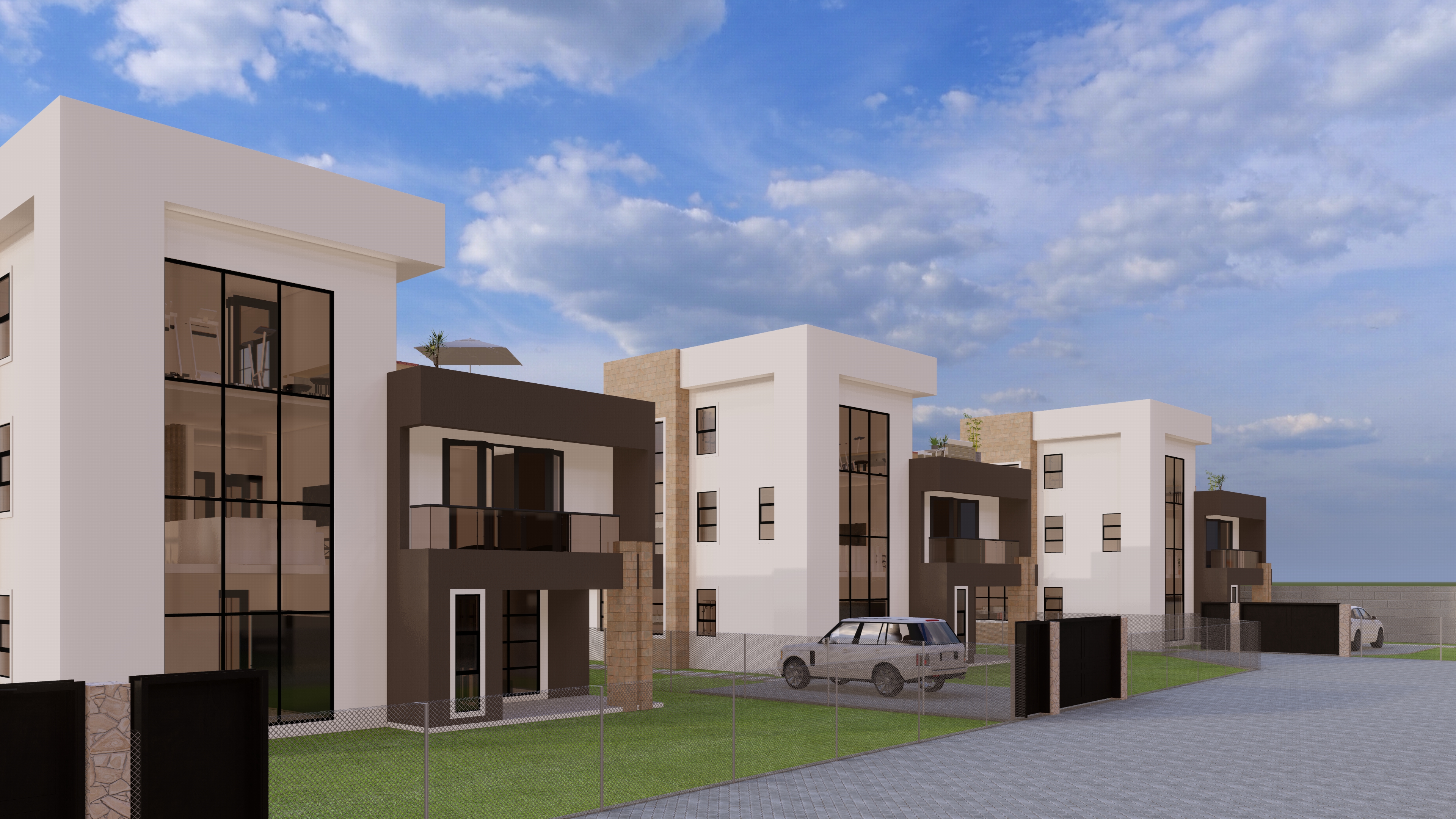 this is a housing estate add trees and vegetation inbackground to give it context have indoor warm lighting have modern street lighting on the short columns on each sides of the gate