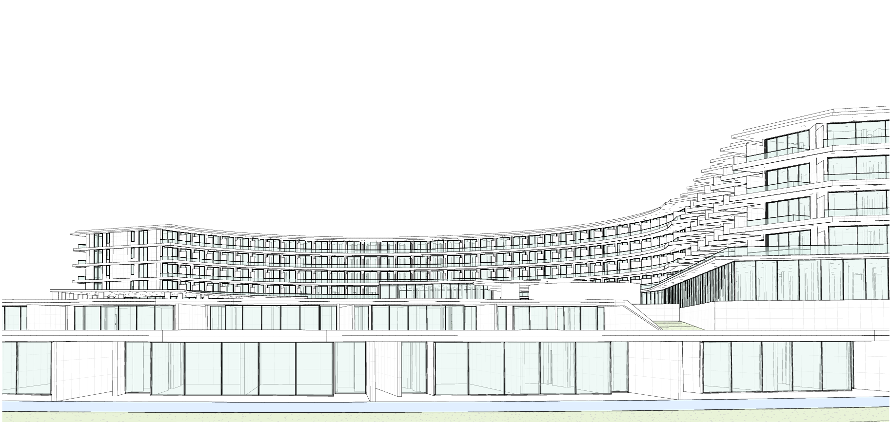 scene render the scene exactly according to the uploaded linework keep the full geometry of the villas in the foreground and the hotel building in the background exactly as drawn preserve the exact camera angle proportions curves terraces and glazing layout create a warm mediterranean luxury resort atmosphere lighting soft warm morning sunlight from the front or front side bright sunlit clean illumination no hard long shadows no backlight even pleasant lighting over all buildings pools and landscaping architecture do not change the architecture geometry or camera apply materials realistically and consistently villas modern white plaster warm beige natural stone accents bronze reflective glazing hotel same material palette as all previous renders to maintain visual consistency balcony greenery add elegant minimal hanging greenery very light delicate not heavy materials exterior walls smooth warm white plaster warm beige mediterranean stone windows bronze tinted reflective glazing with subtle reflections of sky and landscape paths and terraces light beige stone paving if water surfaces are visible turquoise clean water with natural reflections landscape mediterranean manicured clean soft green grass and warm mediterranean plants around villas neatly arranged bushes and low shrubs no wild or messy vegetation controlled designed landscaping add a few agaves small palms in distance and soft mediterranean grasses people add a few small subtle figures in light summer clothing no swimwear place some near villa paths or balconies keep them minimal and elegant style warm mediterranean luxury golden soft sunlight clean high end resort feeling consistent with all previous warm renders we produced warm tones delicate vegetation elegant atmosphere restrictions do not modify architecture geometry camera angle building shapes terrace levels pools or glazing modify only materials landscape lighting and subtle greenery as described