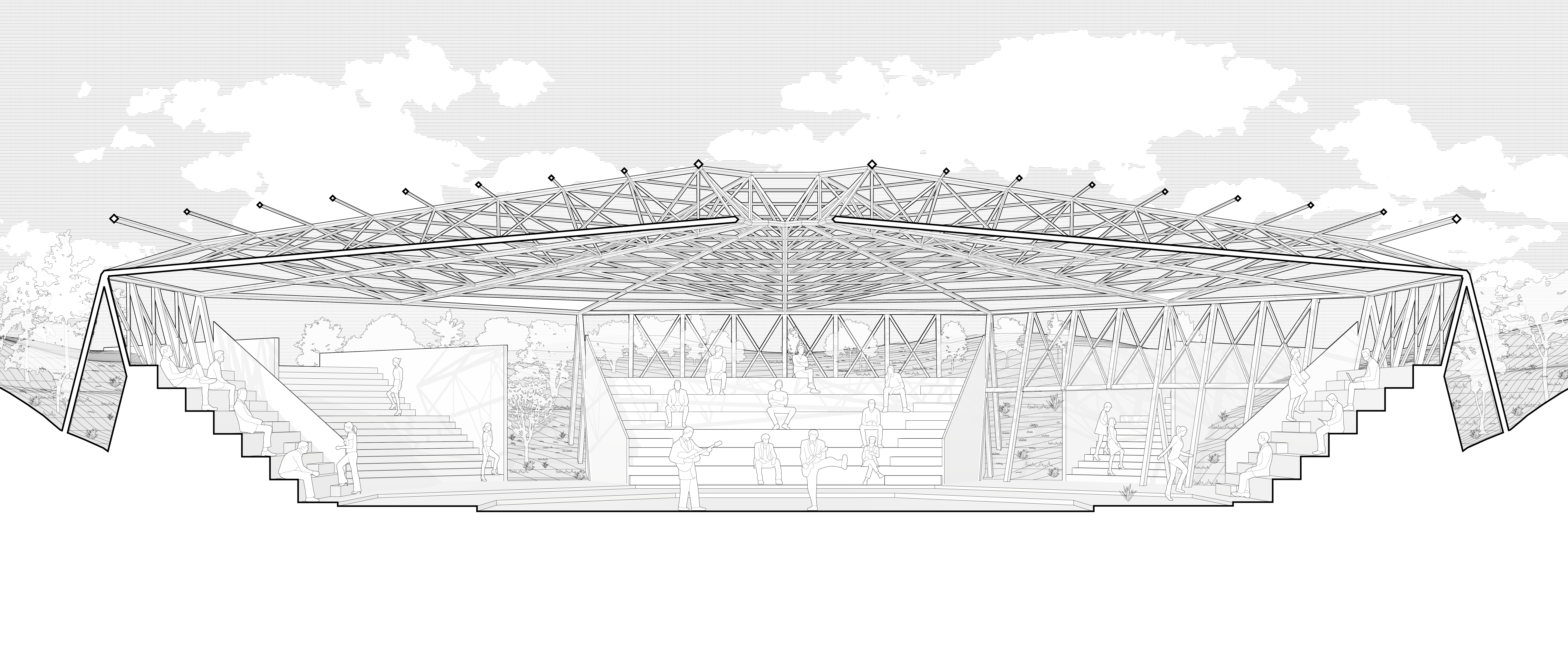 preserve the exact section drawing composition geometry and linework transform this architectural section into a realistic material rendering while maintaining the clarity of the drawing apply real world materials exposed steel truss structure in dark painted steel light concrete seating and stepped terraces smooth cast in place concrete retaining walls and a lightweight roof canopy with translucent or metal paneling introduce soft natural daylight filtering from above creating subtle shadows that emphasize structural depth and layering maintain visibility of the structural system and circulation spaces keep the drawing aesthetic clean and controlled combine crisp linework with soft material shading do not fully replace the line drawing allow lines to remain visible over the rendered materials use a restrained neutral palette of concrete gray off white and muted steel tones keep human figures minimal and lightly toned secondary to the architecture do not alter geometry proportions or structural layout