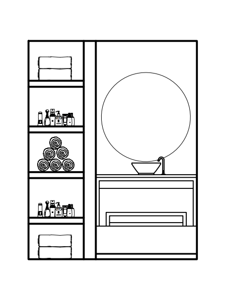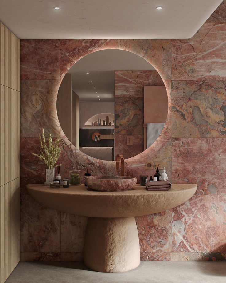 exterior shot create a realistic high end bathroom render inspired by the provided mood board keep the existing layout and proportions exactly the same do not change the camera angle design direction luxury warm feminine elegance with soft lighting and rich materials wall feature area install pink marble slab as a full height feature wall behind the mirror marble should have soft white and blush veining polished finish keep the rest of the walls neutral and clean to let the marble stand out mirror large round mirror centered above the vanity thin brushed bronze frame add concealed led backlighting around the mirror soft warm glow 3000k vanity custom vanity made of natural wood warm oak or walnut tone flat modern fronts no curves matte finish light stone or quartz countertop in a soft neutral tone lighting warm ambient lighting hidden led strip lighting integrated under floating shelves lighting should highlight the marble texture and create a soft glow effect styling accessories add neatly folded luxury towels in soft white or blush tones style shelves and vanity with luxury beauty products dior perfumes recognizable glass bottles high end haircare products minimal black white packaging keep styling minimal and elegant not cluttered overall mood elegant warm instagram worthy luxury bathroom soft shadows realistic materials high detail textures cinematic lighting but natural and believable